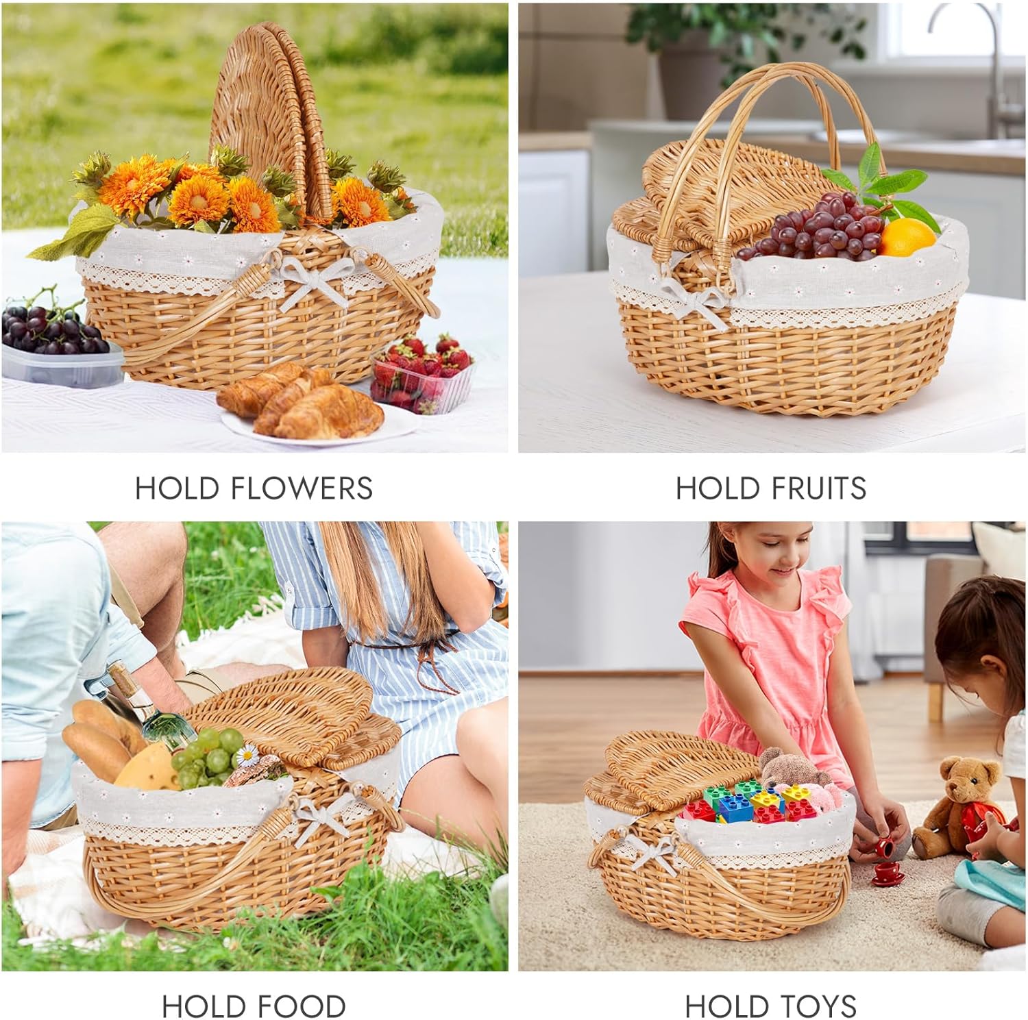- 【Perfect PICNIC BASKET】: This picnic basket can be used for storing various items. Double swing foldable handle allows it to be stacked and stored to save space. With a double-entry lid to keep out dust, can also be used to place beverages and food at picnics. The lining can be easily removed and washed, making it reusable, clean, and hygienic. The lace detailing adds a beautiful touch