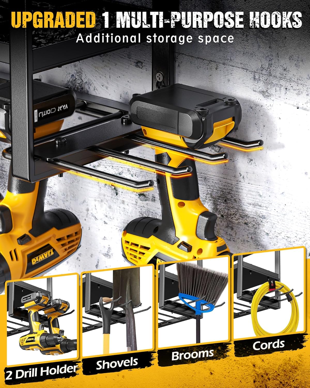 - UPGRADED DESIGN: The bottom shelf holds 7 drills, with additional 1 multi-function hook on the side to store up to 2 more drill or shovels, brooms, and cords. It's perfect suit for DeWalt/ Milwaukee/ Ryobi tools, make your space more neat and organized
