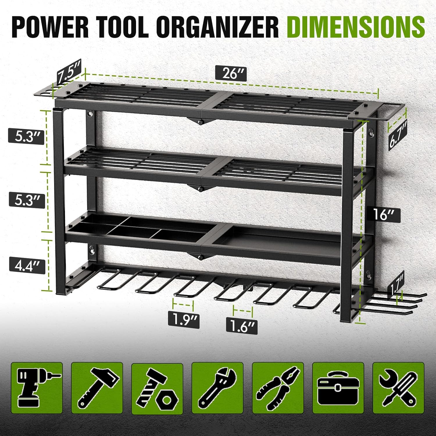 - LOAD BEARING 150 LBS: Our tool organizer is made of premium heavy metal, featuring durability, pressure resistance. It comes with 8 wall anchors to make the rack more sturdy and stable. After extensive load testing, each layer can support up to 37 LBS