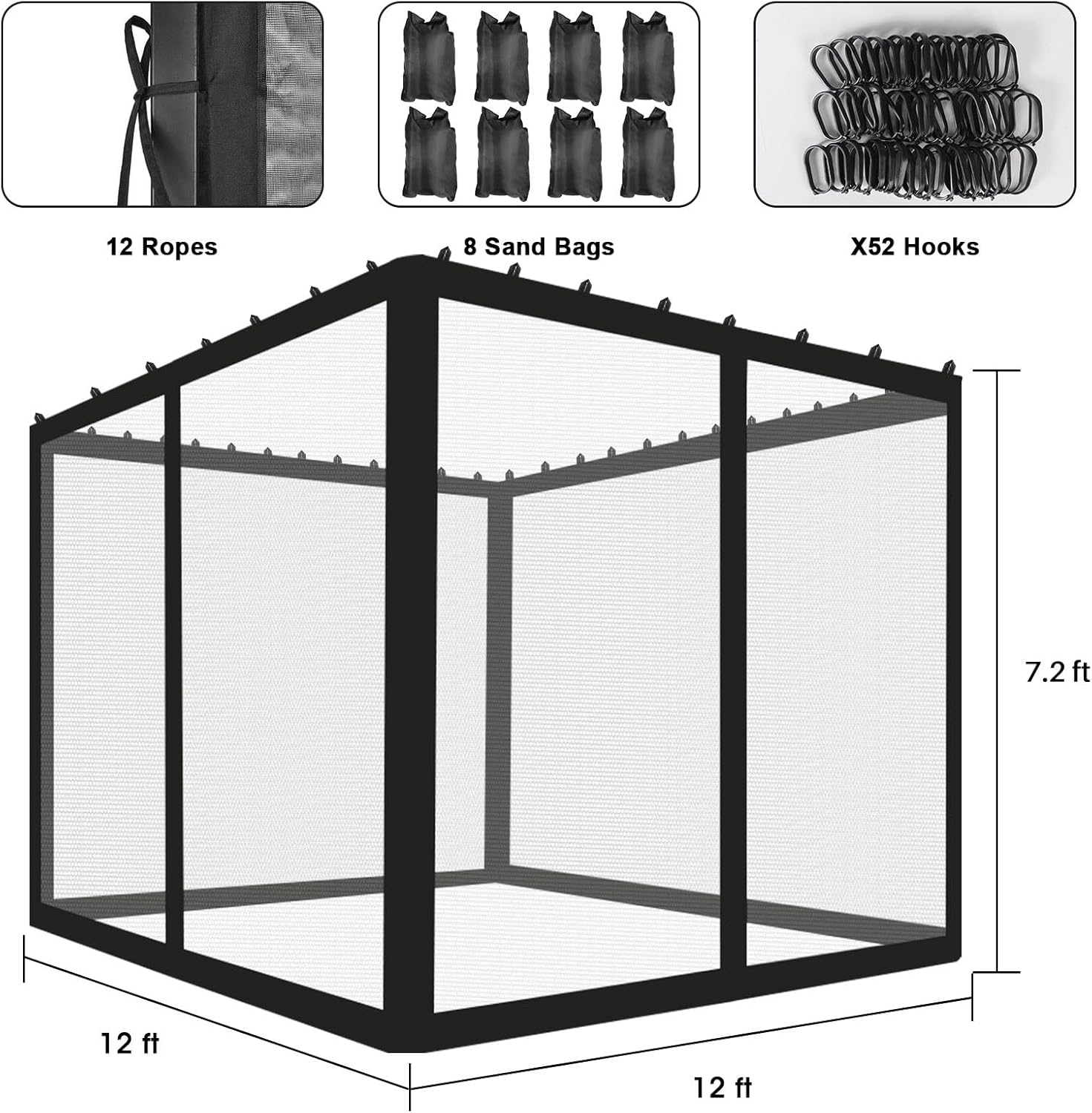 - đď¸ăPerfect Fit & Extra Stabilityă Fits 12x12ft Gazebos â Measures 12ft (L) x 12ft (W) x 7.2ft (H) with 4 zippered panels for full coverage. Includes 8 sandbags (competitors donât offer!) to prevent wind lift-offâno more flying mesh! Always measure your gazebo before purchase.