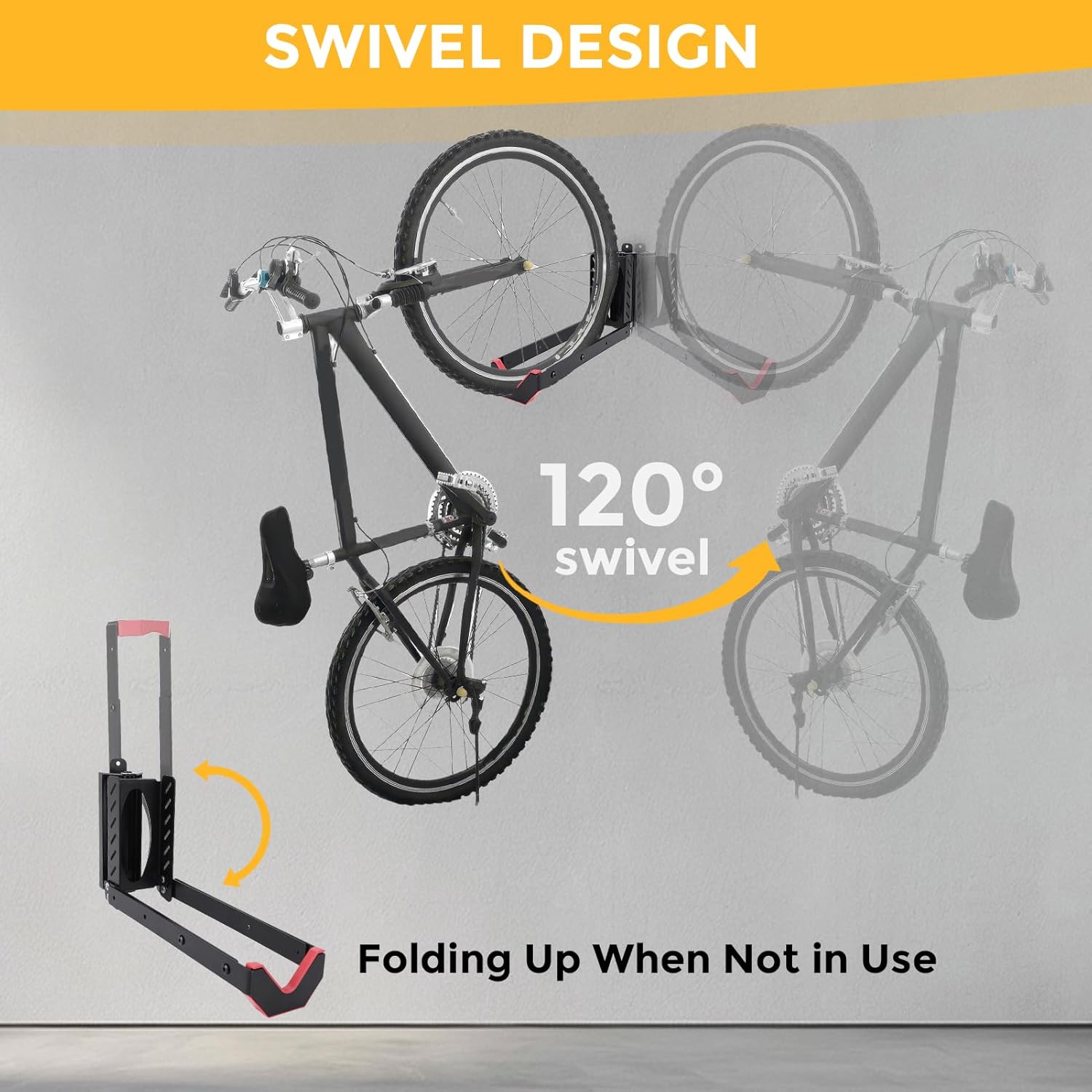 - 120° SWIVEL DESIGN: The swivel bike rack features a unique 120-degree pivot function that efficiently frees up your floor space whilst maximizing wall utilization. Our swivel design facilitates easy loading and unloading of bikes by smoothly rotating left and right.