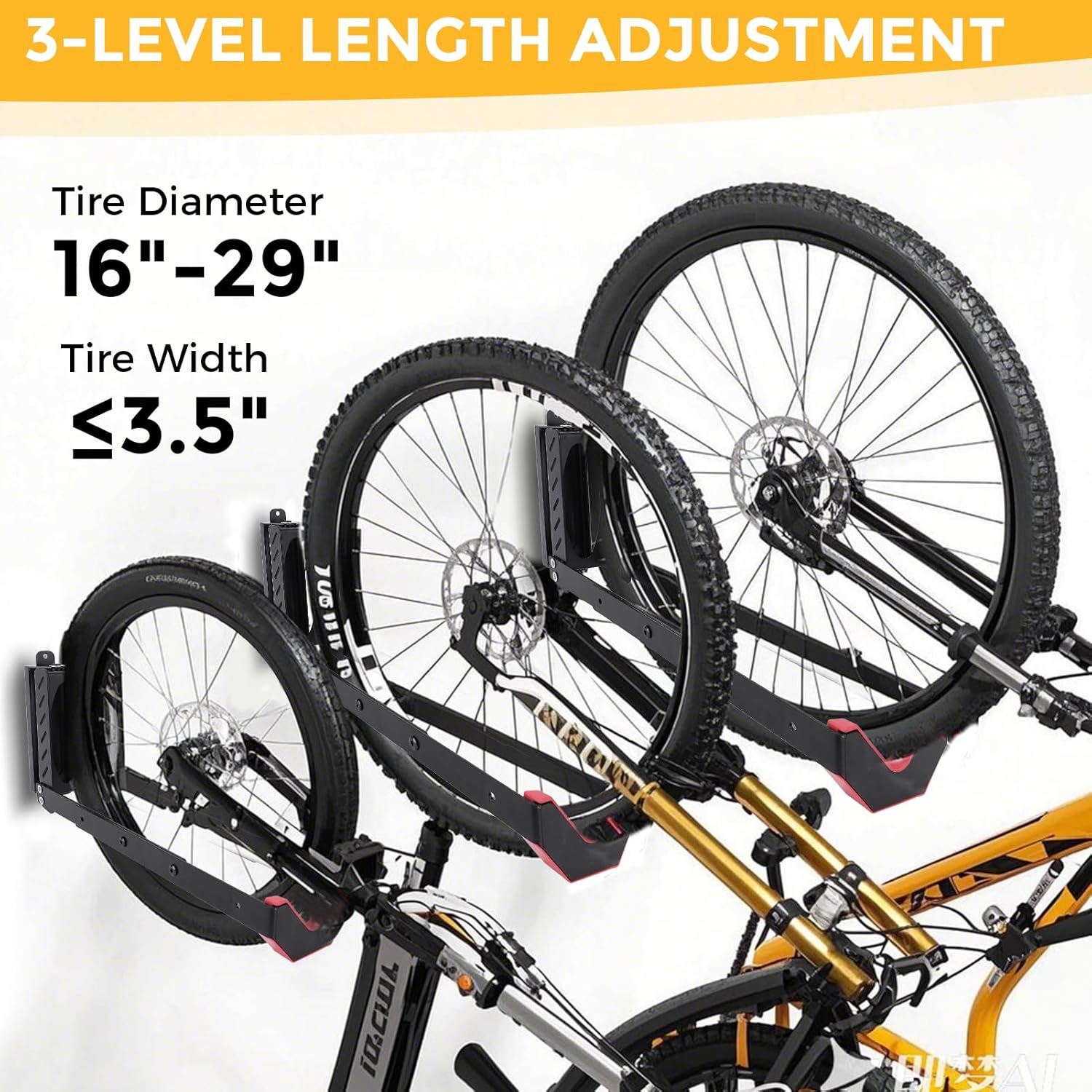 - THREE-TIERED LENGTH ADJUSTMENT: Our bike wall mount with three adjustable length, which can customize your bike to fit whatever size you have. When you want to park your bike, all you need to do, is balance your bike on its rear wheel and smoothly roll it into the rack.
