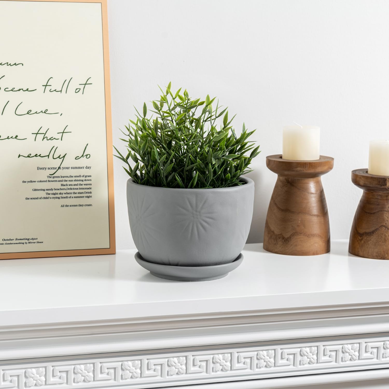 MyGift 7 Inch Grey Ceramic Plant Pot with Drainage Hole and Attached Saucer, Modern Decorative Embossed Sunburst Planter Container for Indoor Home Garden