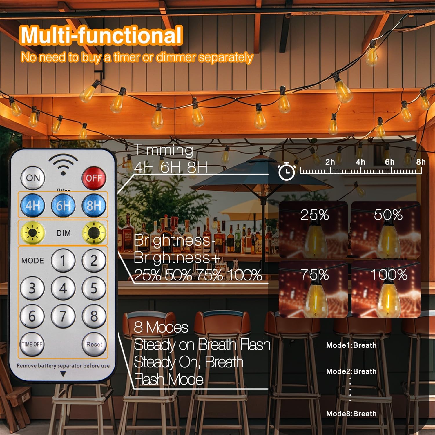 - These 120FT lights string are the perfect solution for bringing beautiful and functional lighting to your outdoor spaces. With the remote, you can easily turn the lights on and off, adjust the brightness levels, set the 6H/8H timer, or switch between different flashing modes