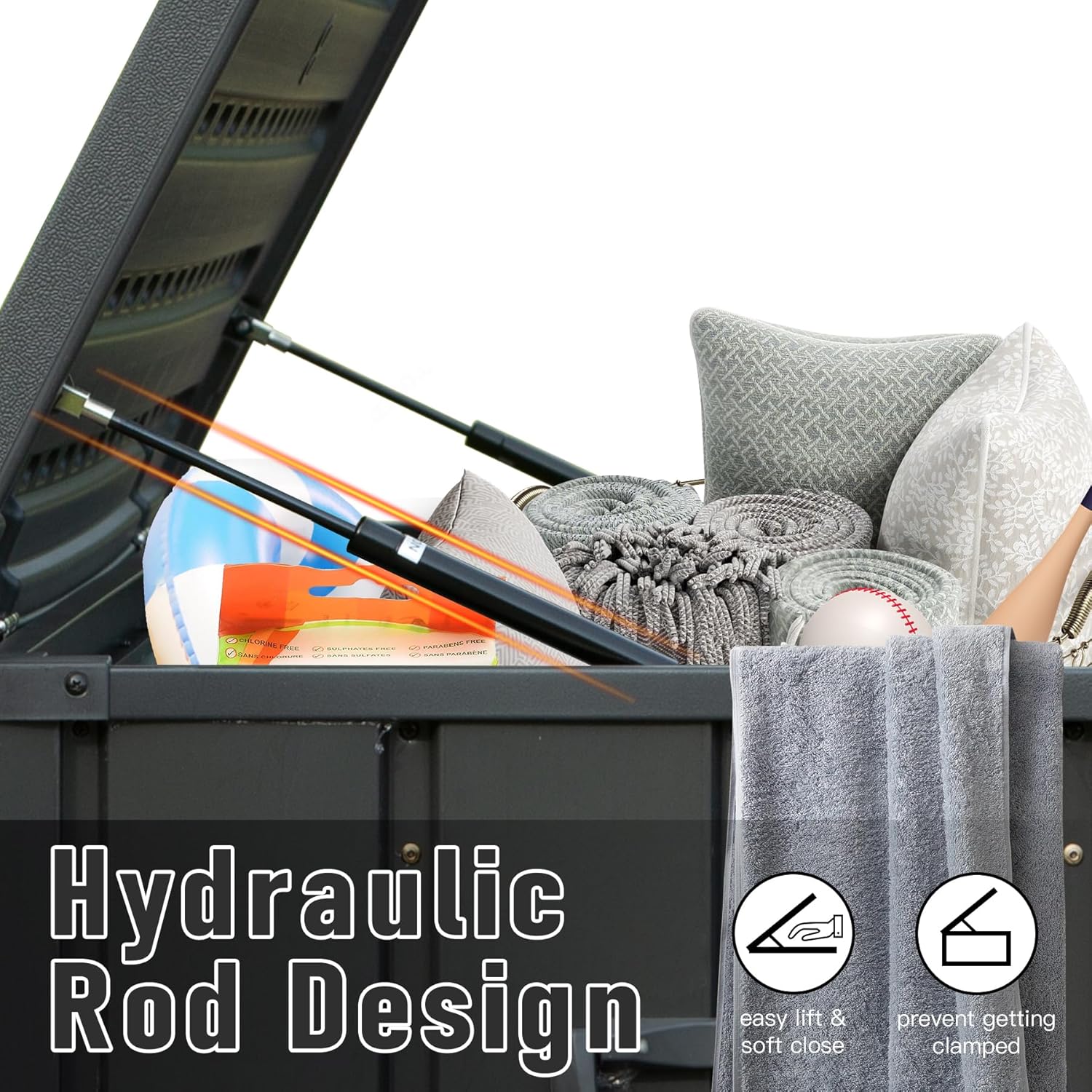 - Easy-to-Use 100 Gallon Deck Box with Mobility Rollers and Labor-Saving Pistons: Moving your storage box has never been easier. The 100 gallon deck box comes equipped with portable side handles and mobility rollers, along with labor-saving pistons, providing extra support and strength for seamless transportation.