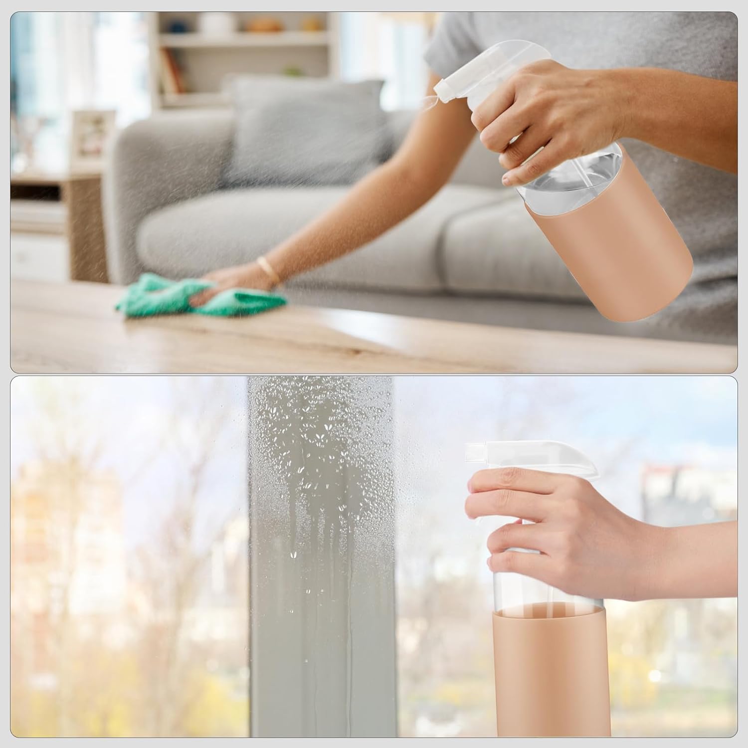 2 Pack Glass Spray Bottles with Silicone Sleeve, 16 oz Empty Refillable Containers with Adjustable Spray Nozzles, Spray Bottles for Hair, Cleaning Solutions and Plants Pink&khaki