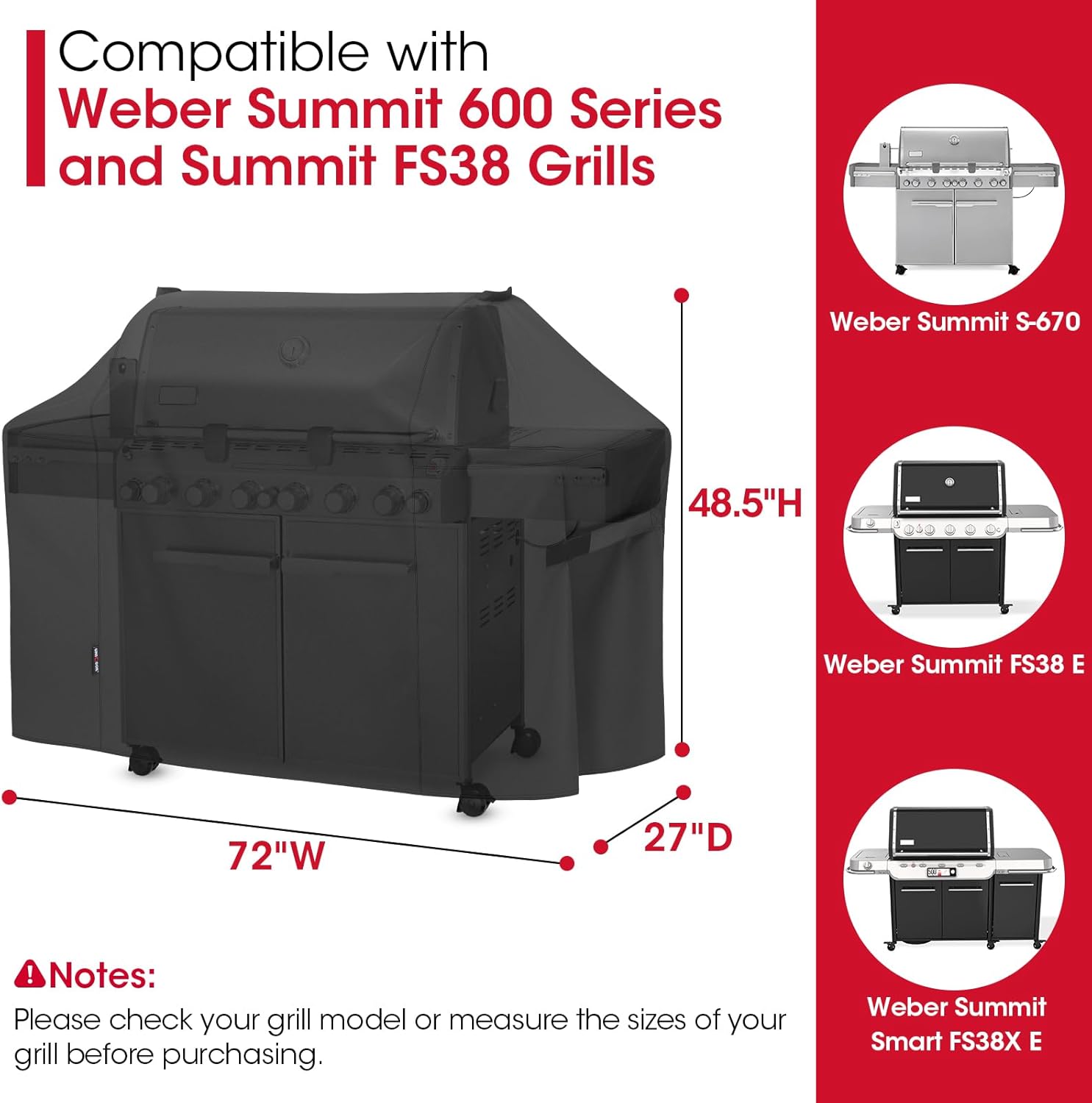 - Large Grill Cover Dimension: 72"W x 27"D x 48.5"H, the Unicook gas grill cover for outdoor grill is compared to Weber 7109, compatible with Weber Summit 600 series and Summit Smart gas grills, such as E-620, E-670, S-620, S-670,FS38, and FS38x gas grills. It also fits 5-6 burner grills up to 70” wide from brands like Charbroil, Nexgrill, Kenmore, Monument, Napoleon and etc