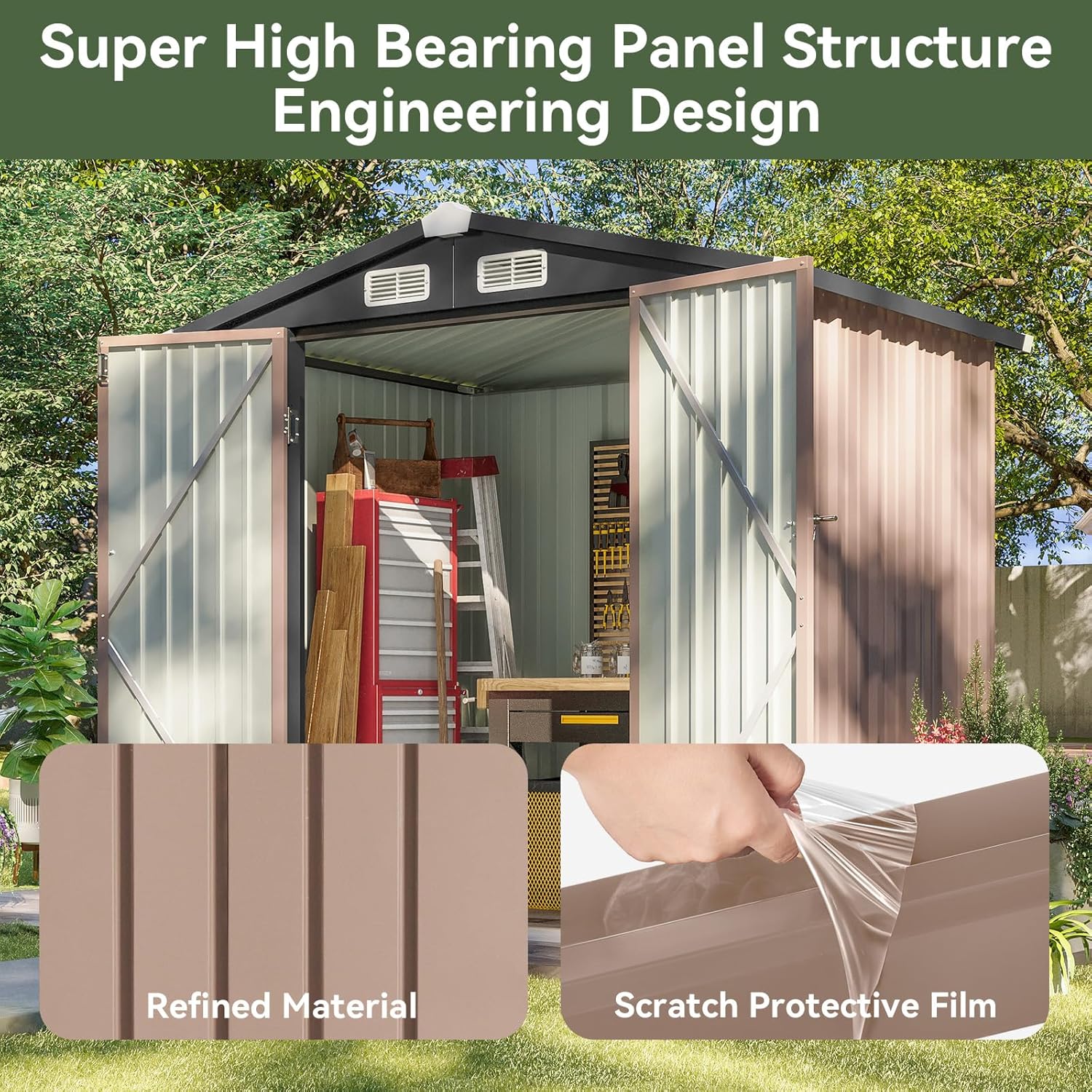 - Efficient Drainage & Ventilation: The shed's sloped roof maximizes interior space while preventing rainwater accumulation. Strategically placed vents enhance interior airflow, maintaining a breathable environment. Secure, padlock-ready doors (padlock not included) offer easy access and heightened security for your stored items