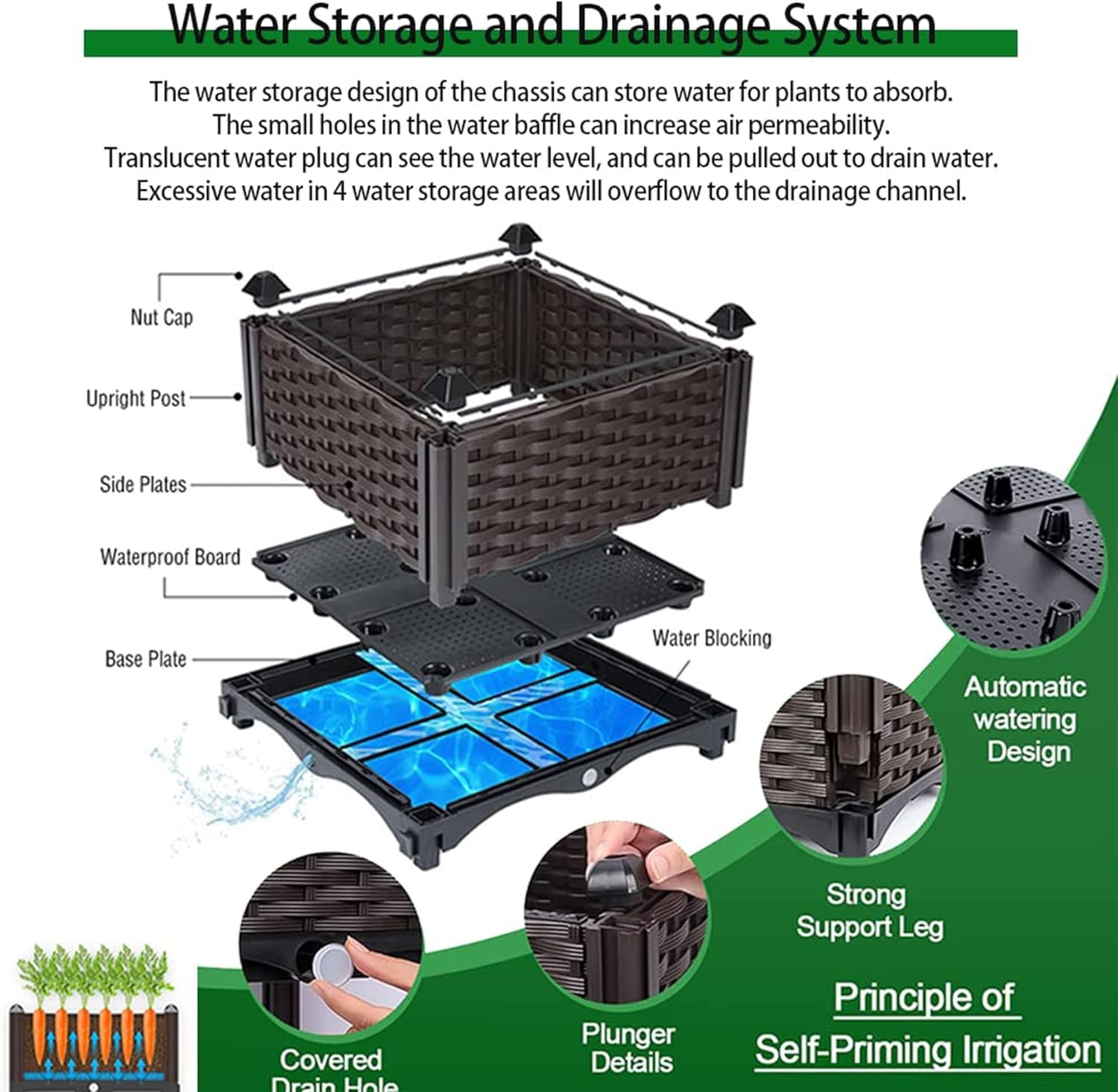 - 【Watering System with Reservoir】:The flower box features self-watering disk & drainage holes, can provide water reservation spaces to avoid plants over-drying when forget to water for some time. Drainage holes will effectively drain out excess water, preventing roots from decay.