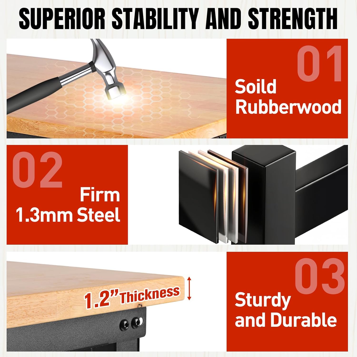 - SOLID RUBBER WOOD AND REINFORCEMENT BARS: solid rubber wood tabletop. With an upgraded metal frame, this heavy-duty workbench has a weight capacity of over 2,000 lbs. Extra support rods make the workbench even more stable.