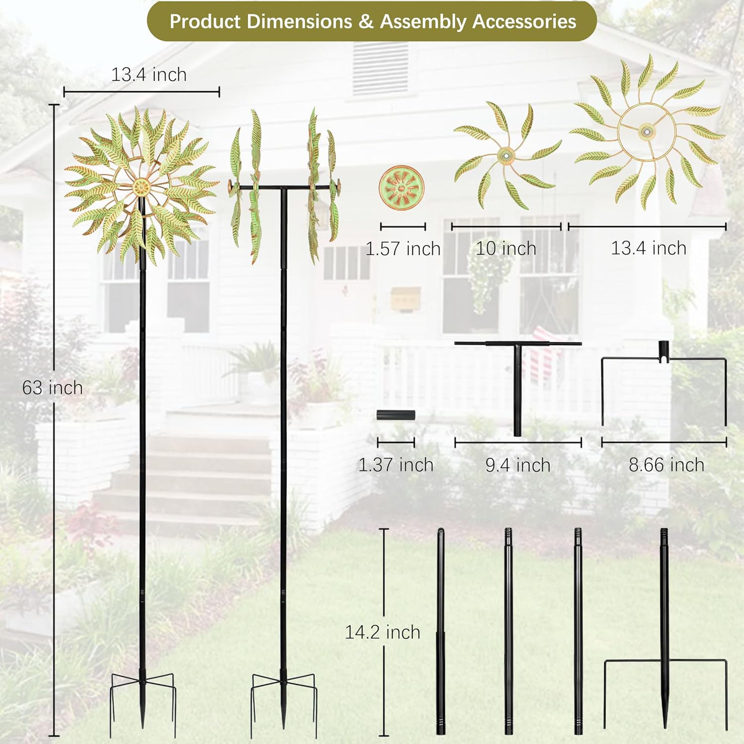 - LARGE SIZE AND QUALITY: 4 (2 Large + 2 Small layer Flower Wind Spinner) wind sculptures & spinners are made of durable, rust-resistant painted metal.The 13.4-inch wide by 63-inch tall extra-large Senflame wind spinner features sturdy metal construction and easy-to-spin blades that rotate smoothly on sealed bearings.