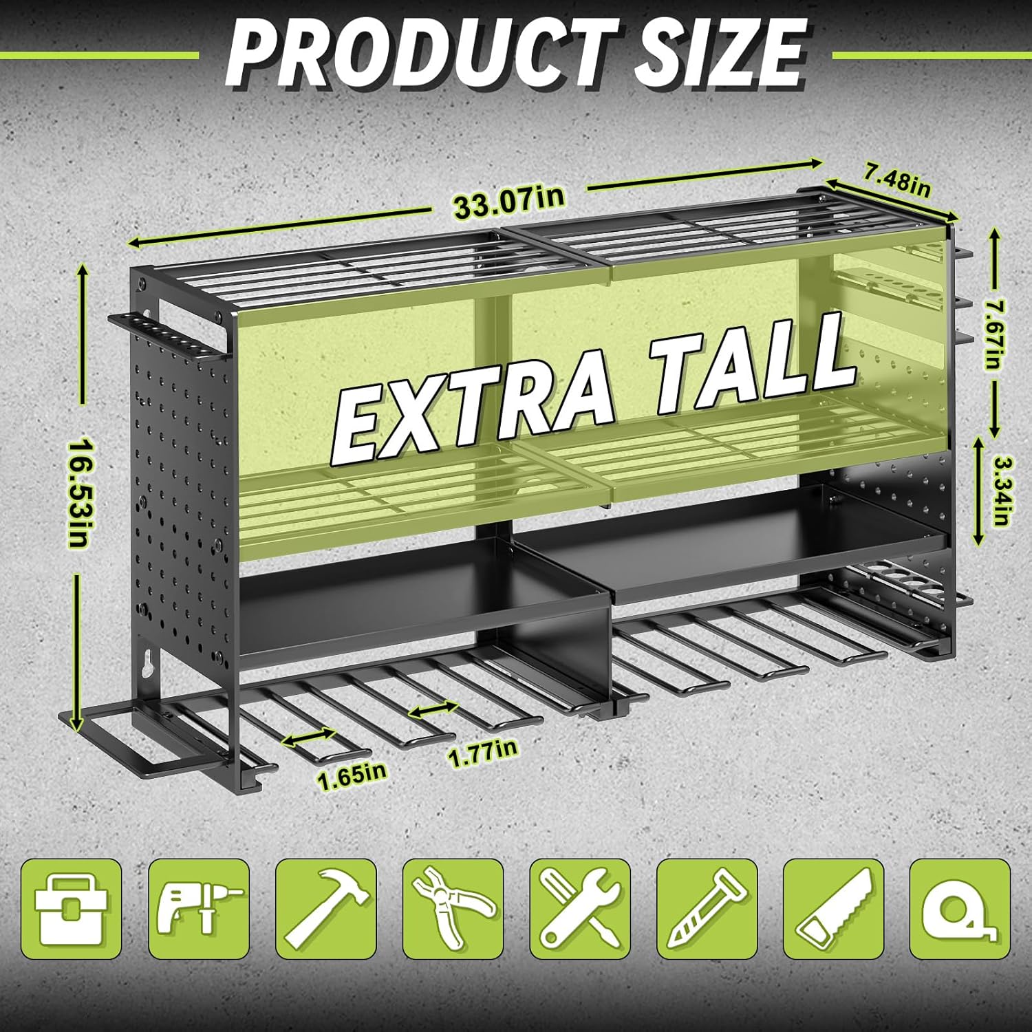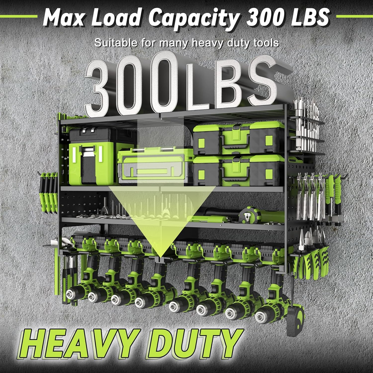 - 4 Layers Large Capacity:The garage tool holder can meet the needs of more than 50 kinds of tools placed, with a solid compartment can be placed in the screws and other small tools, the third layer of the heightened design is convenient for storing the tool box