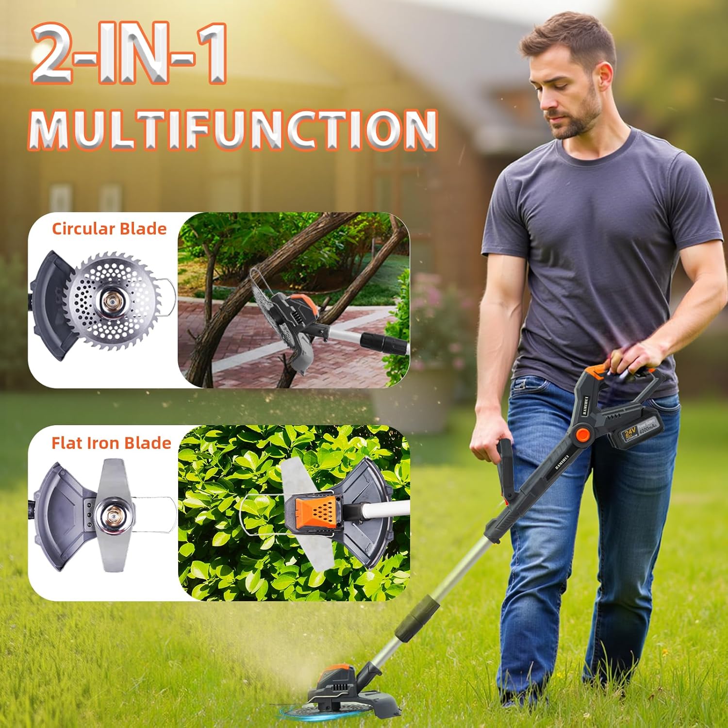 - 【🎁Electric Grass Trimmer Kit Includes】1×Electric Weed Wacker | 2× 24V 4.0Ah Batteries | 1× Charger | 2× 8" Saw Blades | 2× 9" Steel Trimmer Blades | 1× Double-Head Screwdriver | 1× Wrench | 1× Anti-Collision Ring | 1× Shoulder Strap | 1× User Manual. All neatly packed in a stylish color box—making it the perfect gift for friends!