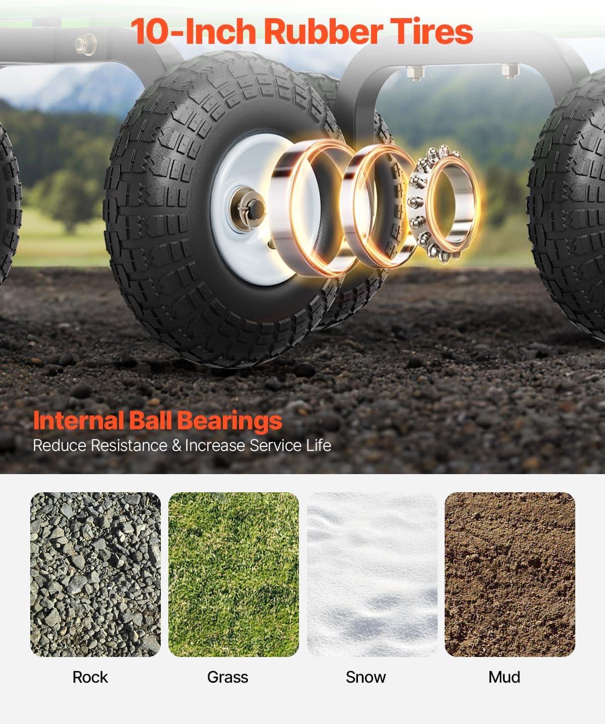 - 360° Rotating Wheels: Equipped with 10-inch rubber tires and metal hubs, the wheels of this heavy duty steel garden cart ensure smooth movement across various terrains, including grass, mud, rocks, and snow. Its sturdy design provides stability while reducing the effort required for transport.