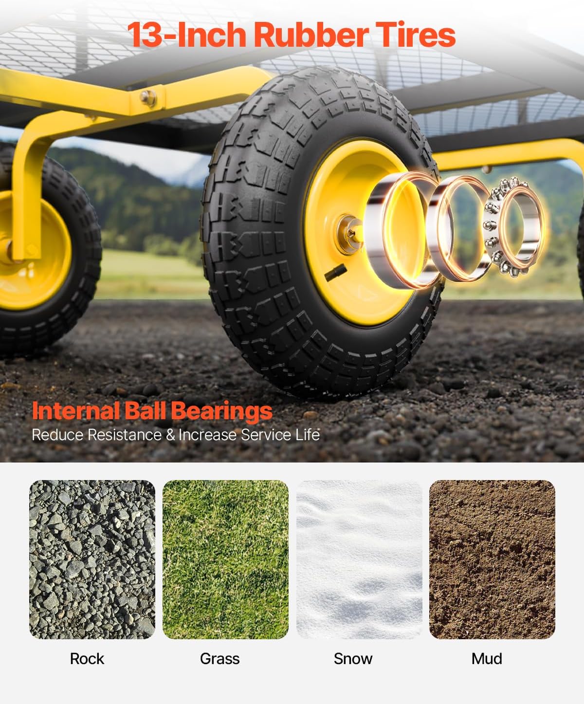 - 360° Rotating Wheels: This yard cart features 13-inch rubber tires with sturdy metal hubs that provide smooth mobility on grass, mud, rocks, and snow. Its robust design ensures stability across various terrains, making your outdoor transport tasks effortless.