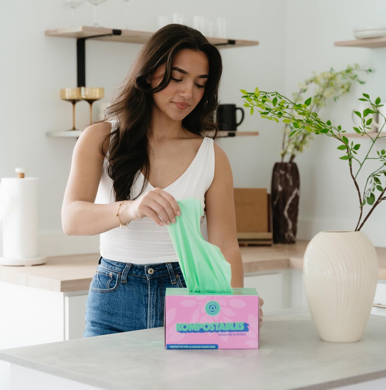 - Puncture/Heat Resistant with Strong, Easy-Tie Handles: Engineered to handle tough kitchen waste without tearing or leaking, these handle tie, eco-friendly trash bags are built for dependable performance. Kompostables are thicker and more heat resistant than other large compost bags, which often melt when in contact with warm food.