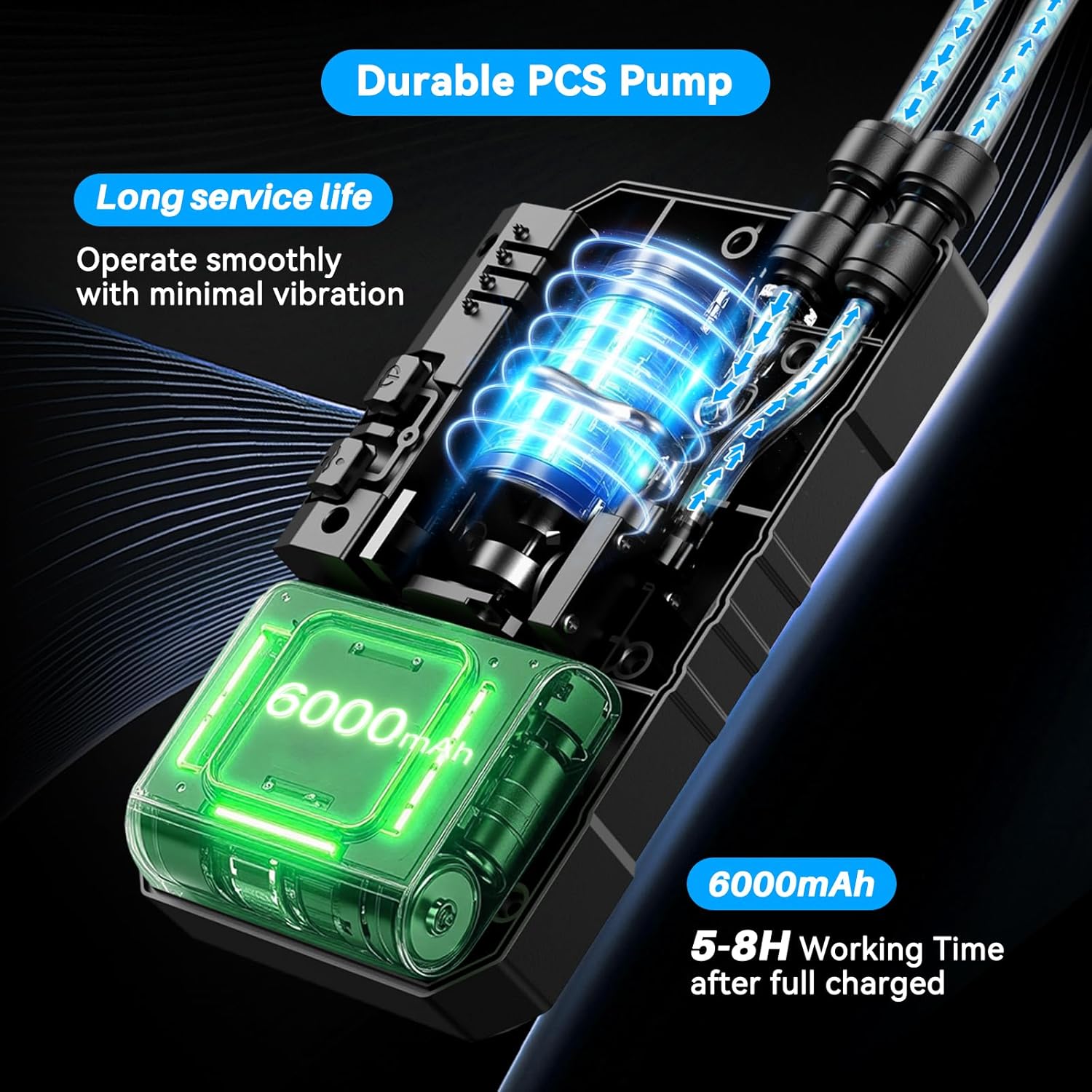 - ⭐【6000mAh PCS Pump】- This high-performance cooling system features a German-engineered PCS pump for efficient operation and enhanced durability. With a built-in 6000mAh rechargeable battery, it delivers 5-8 hours of continuous misting—perfect for extended outdoor use on canopy tents, patio umbrellas, and other summer essentials.