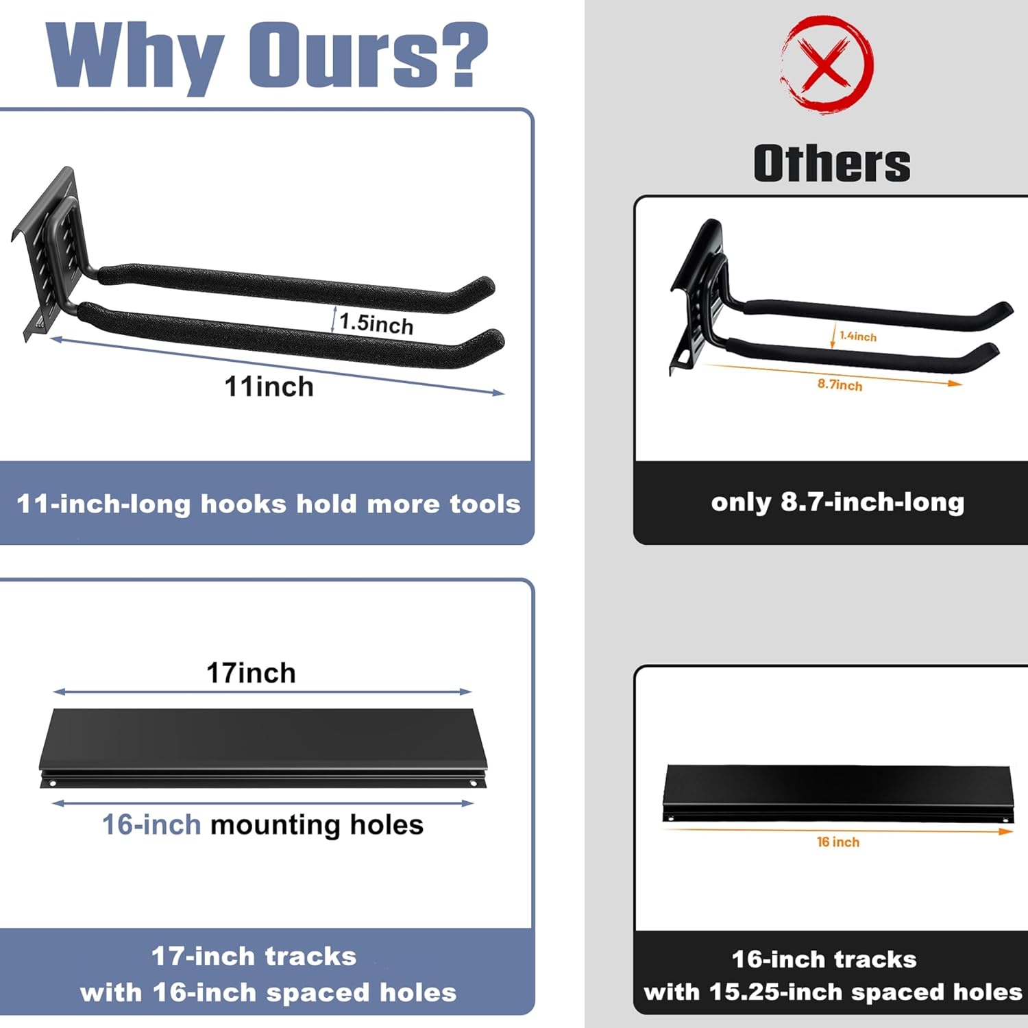 - 8 Heavy-Duty Double-Prong Hooks: Each 11-inch hook holds 3-5 tools or 4-5 folding chairs, providing efficient storage for various items. Designed for secure and accessible organization