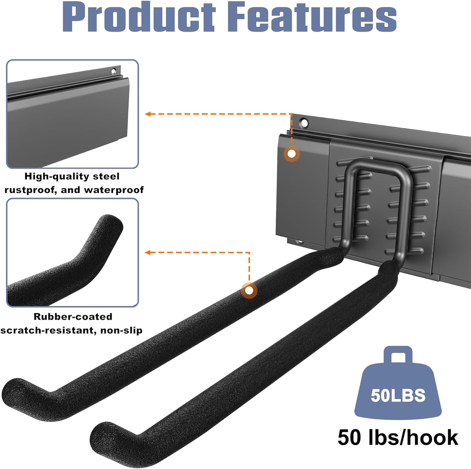 - Sturdy and Reliable Construction: Built from high-quality metal with a powder-coated finish, the durable tracks and hooks support up to 50 lbs per hook. Rubber-coated hooks prevent slipping and scratches