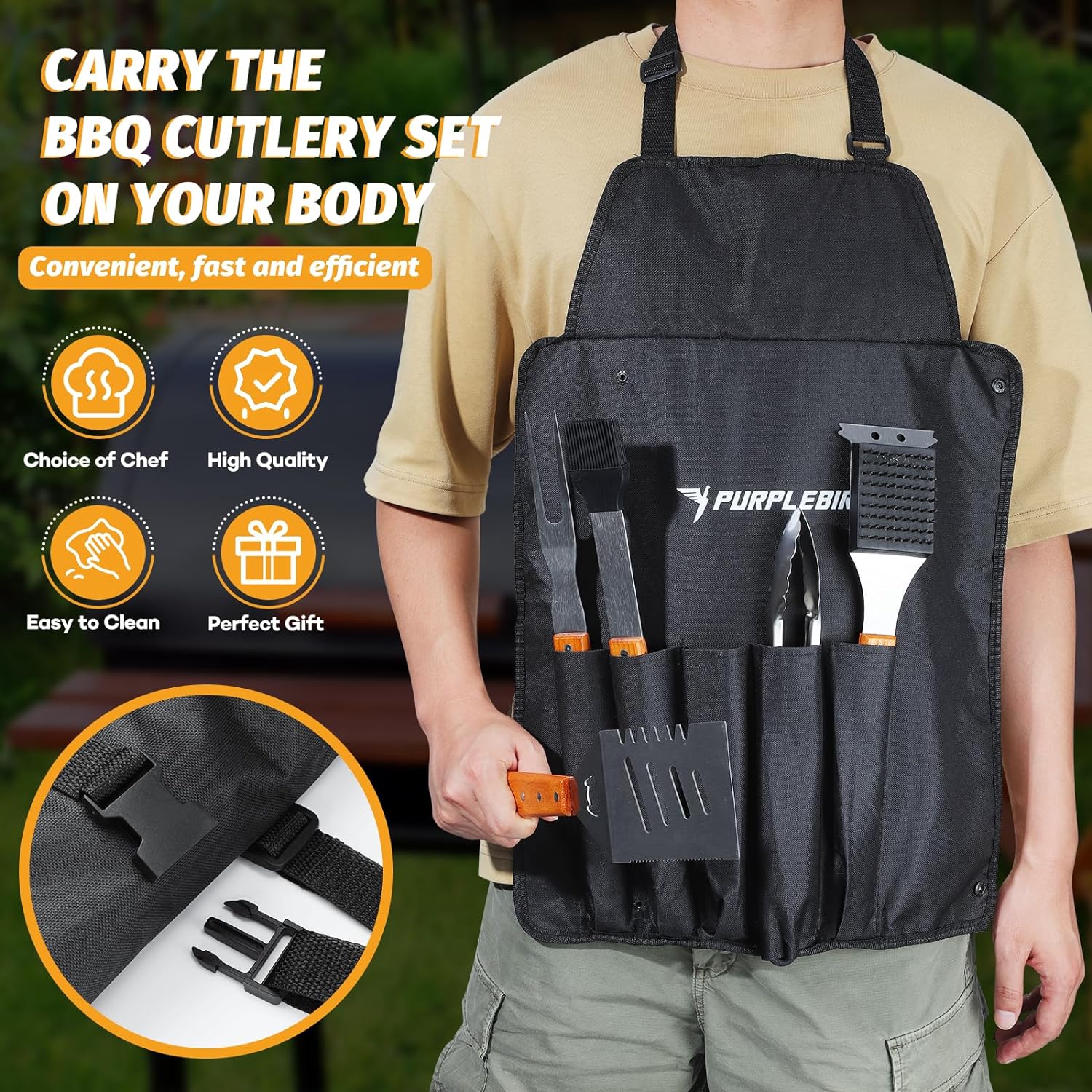 - Both Storage & Apron · The storage bag designed to carry the whole grill tool set also doubles as an apron to protect your clothes from grease. Meanwhile, the storage compartment on the apron provides convenience to reach the grill accessories for outdoor grill. The BBQ grill accessories set is portable and lightweight. It’s able to bring you a perfect and unique BBQ experience outdoors or indoors!