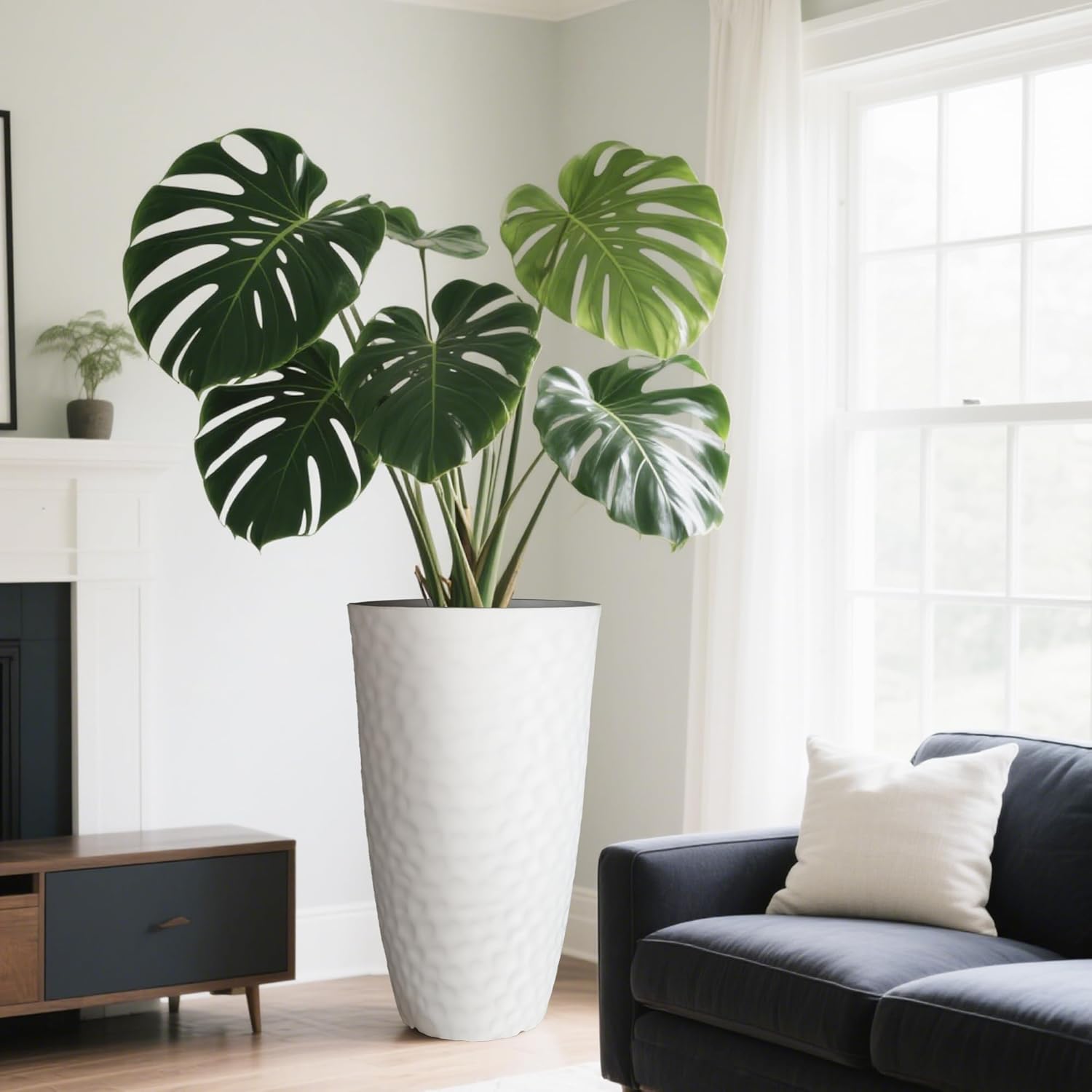 Worth Garden 24" H Tall Hammered Texture Planters Set of 2 - Matte White Plastic Flower Pot with Drainage Holes, Modern Outdoor Indoor Lightweight Pots for Large Plants, Durable Decor Containers