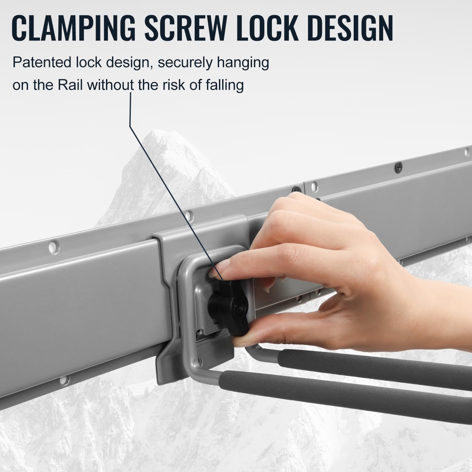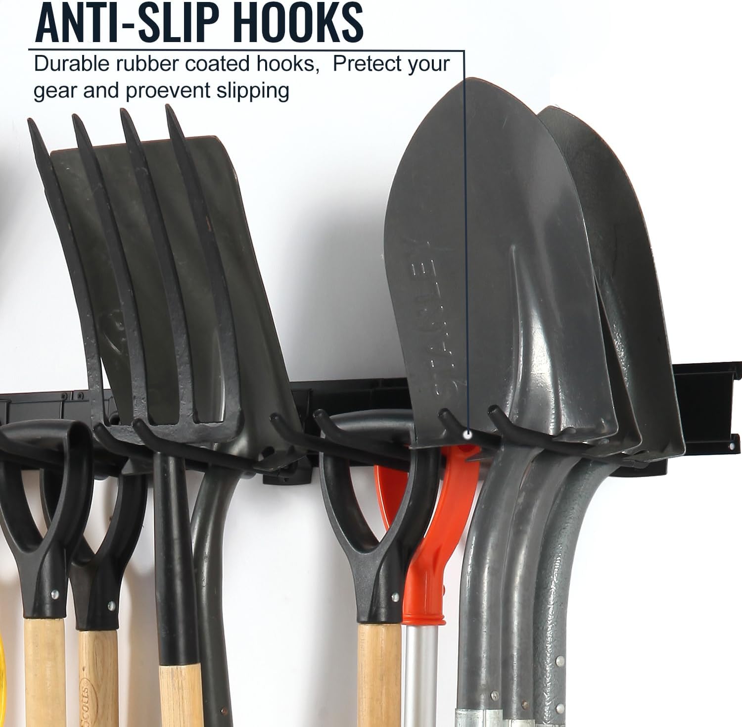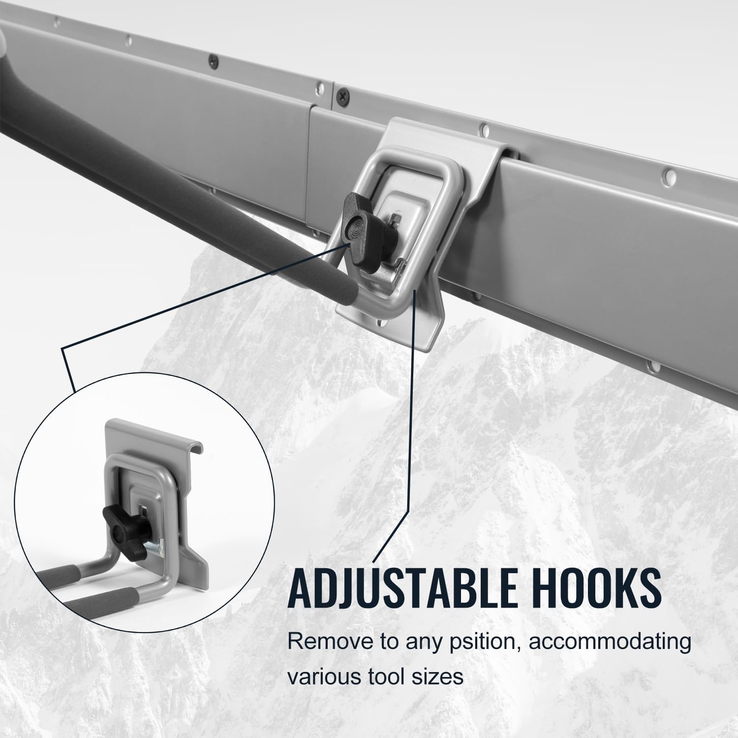 - ADJUSTABLE VERSATILE STORAGE: With a clamping screw, the hooks adjust along the wall track, accommodating various tool sizes. This garage storage system is ideal for organizing shovels, rakes, brooms, and more, making it a perfect yard tool organizer for garage.