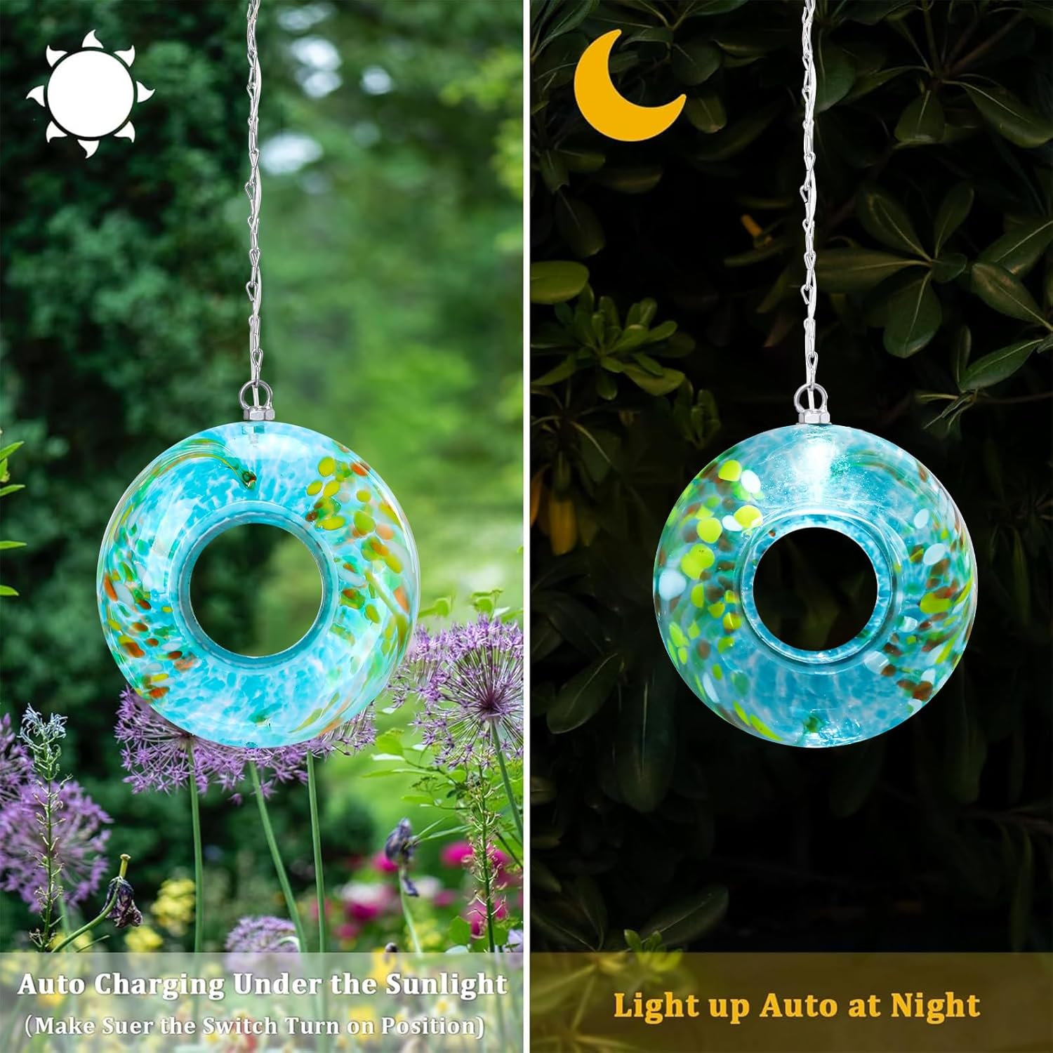 - Unique Glass Bird Feeder: Has a colorful glass design which reflects beautiful lights in the sun and attracts birds to feed, making your home and garden more lively. With new solar lights design to guide the birds to feed at night
