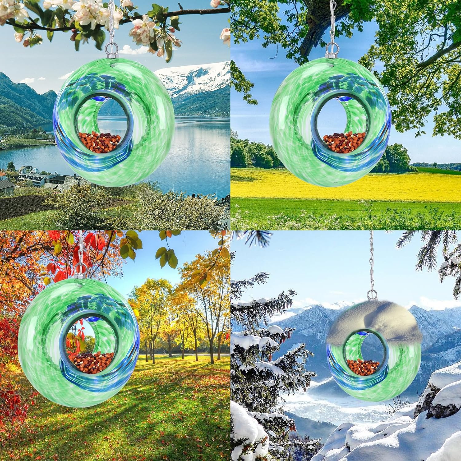 - Easy to Fill: The glass feeder can be filled with black-oil sunflower seeds, cracked corn, hulled sunflower seeds and millet, suitable for northern cardinal, blue jay, finch and the other birds.The bottom of the hanging bird feeder has a hole to keep the seeds dry