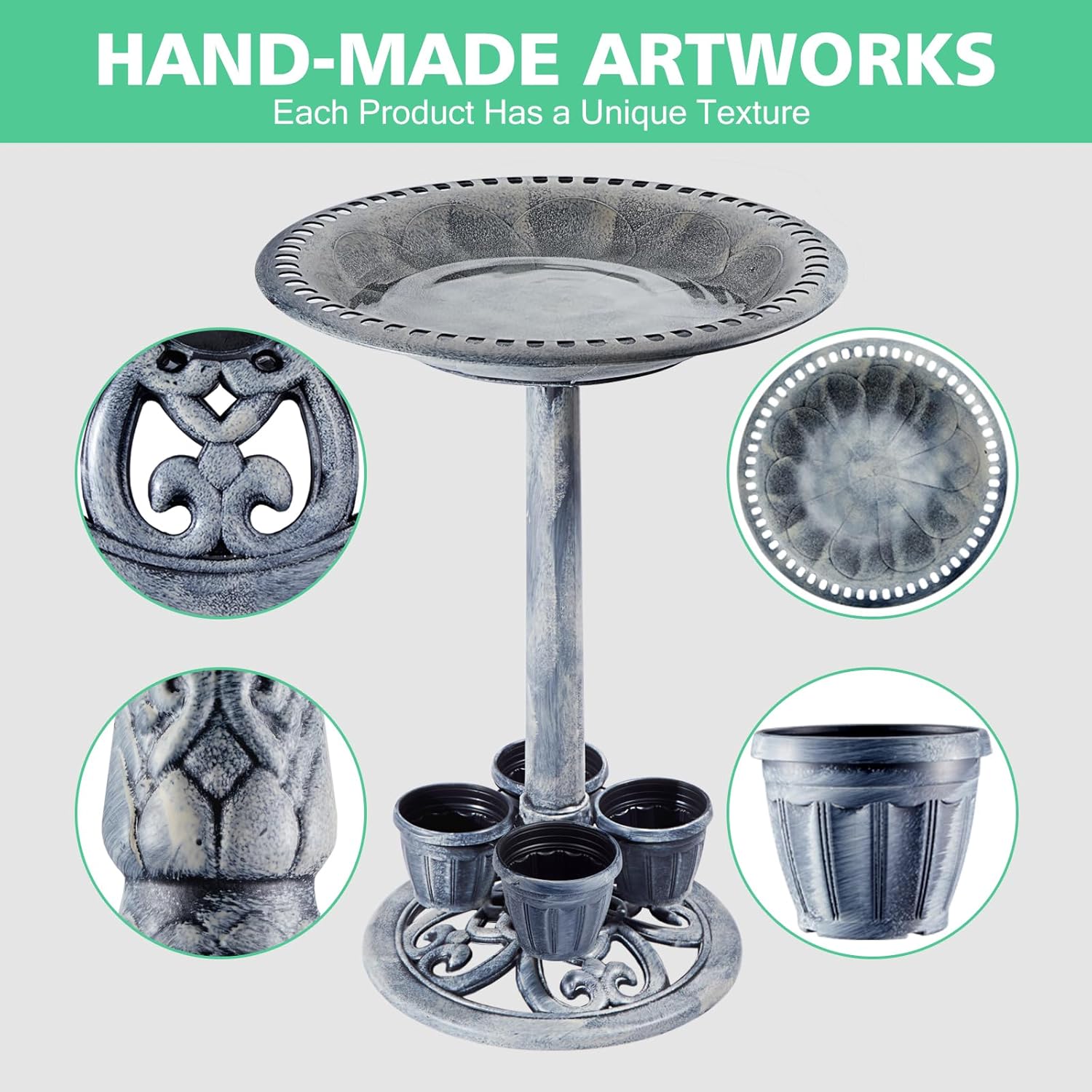 - VERSATILE DESIGN and 4 FLOWER POTS: Our bird bath features a unique design with 4 planters, allowing you to customize and enhance your outdoor space with your favorite flowers and plants. Add a touch of elegance and color to your garden, patio or yard