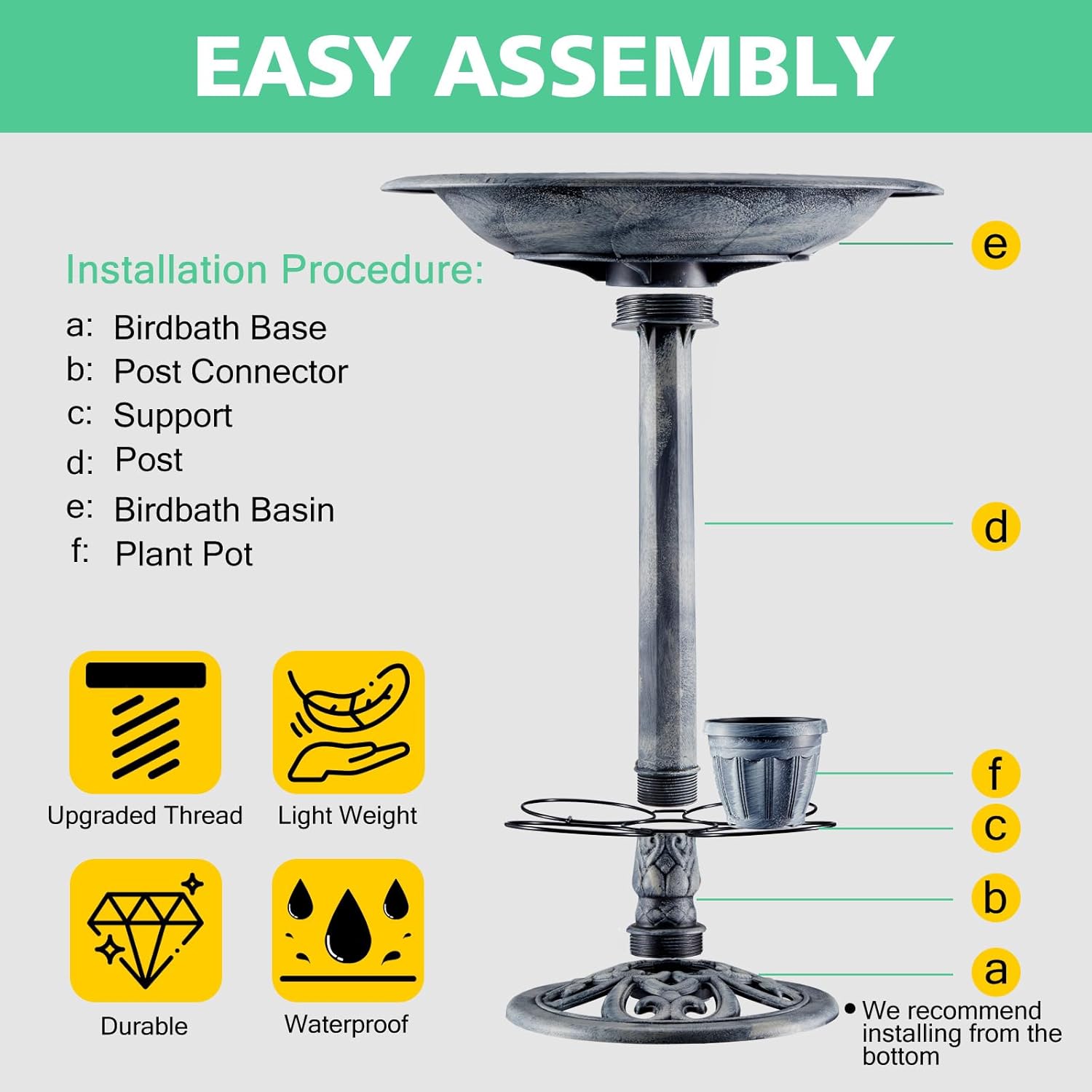 - STURDY BASE and FILLABLE DESIGN: Equipped with 3 ground stakes to keep it in place. Fill the voids in the base posts with sand or water to add weight to the bird bath bowl and keep it upright for your feathered guests