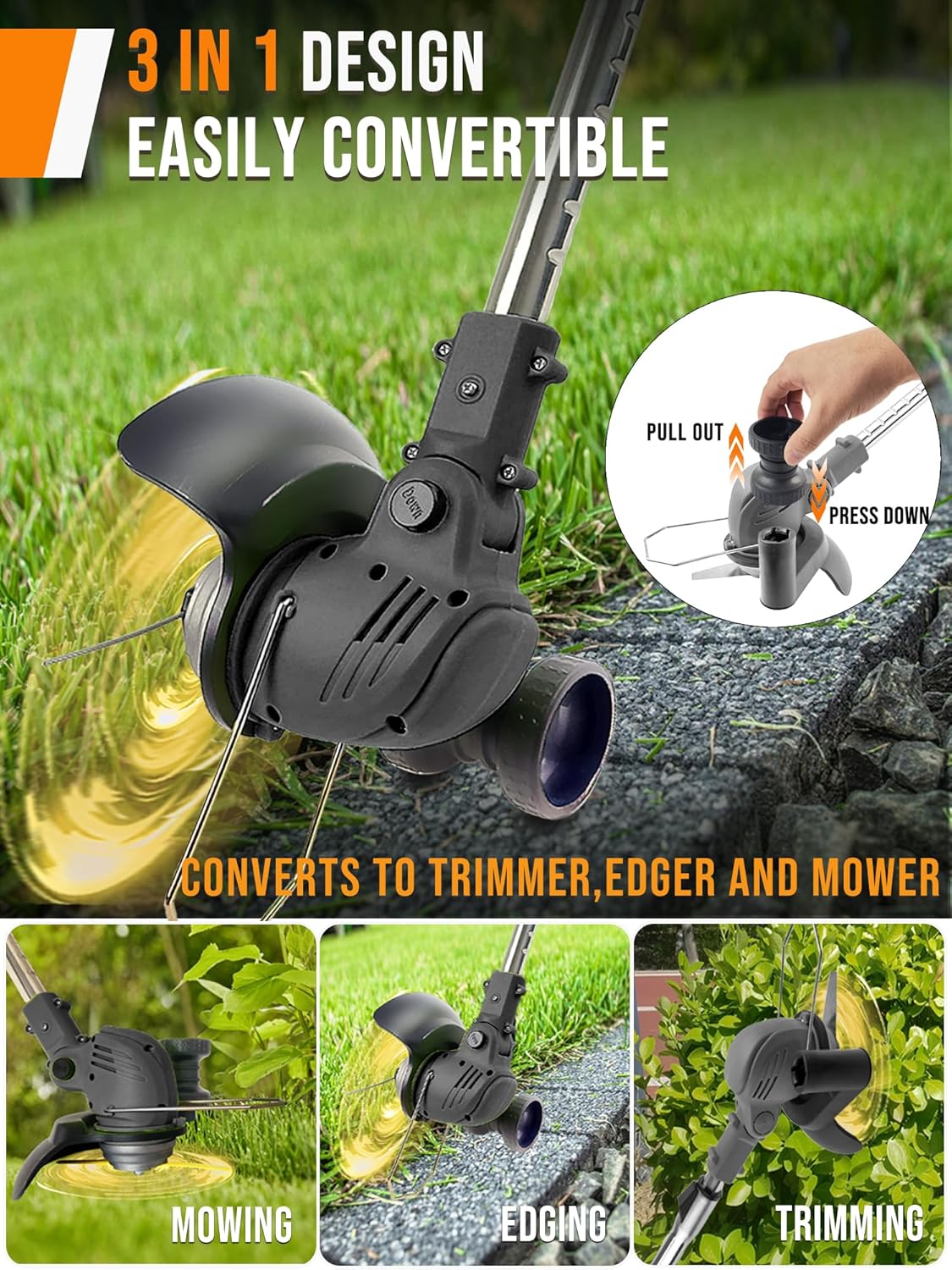 - 【Multiple Adjustment for Use】The weed cordless eater battery powered length can be adjusted from 33" to 47", 360° adjustable handle and 0-90° pivoting cutting head for multi-angle trim, the detachable side wheels ensures quickly switch edging modes, easily trimmer lawn and tight areas which cannot reached.