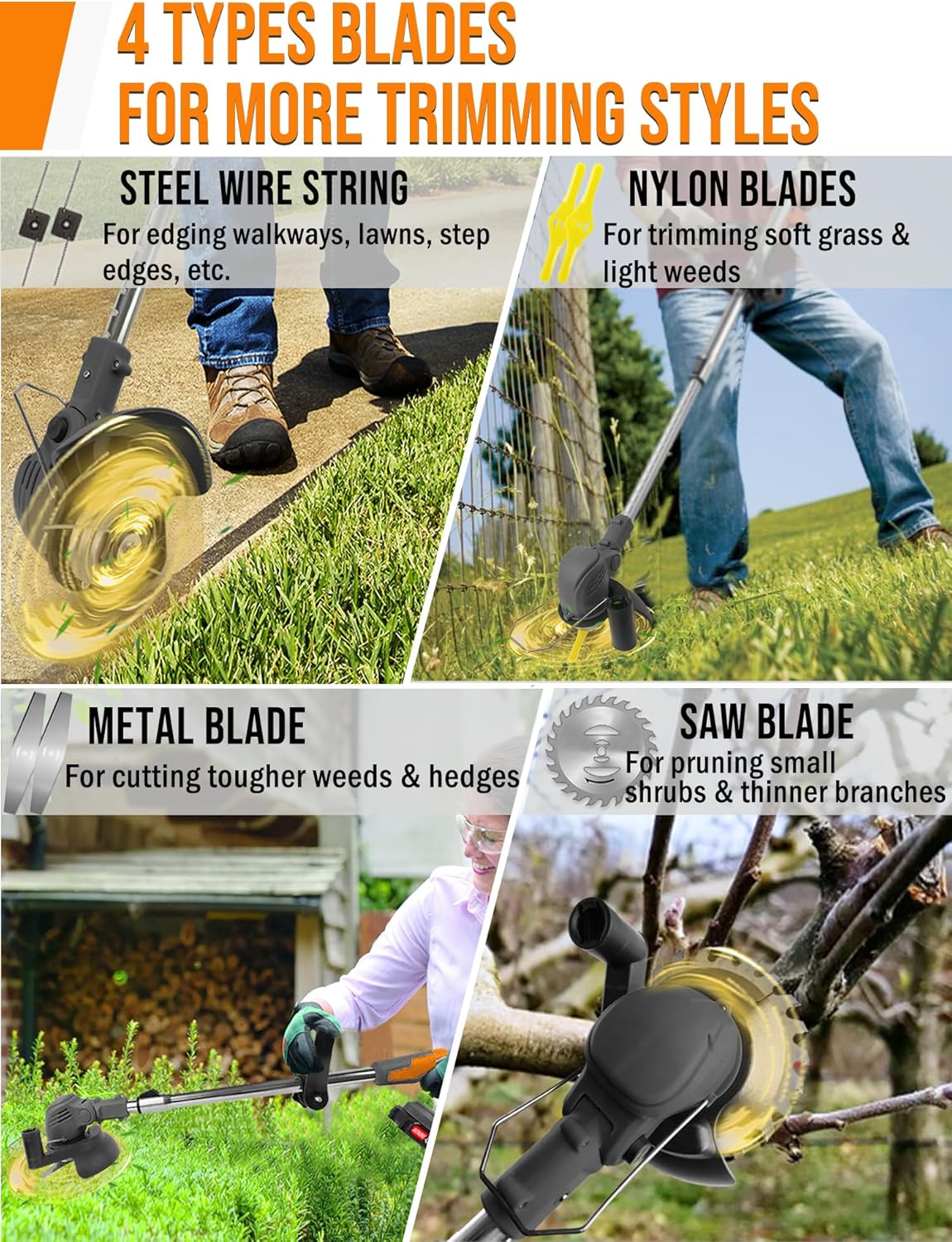 - 【4 Types 26Pcs Blades】The battery weed wacker equipped 4 types of blades, enough to meet all of your weeding needs. Steel wire blade & nylon blades: for edging, soft grass and tender weed; Metal blade: for ackle tougher weeds and hedges; Saw blade: for pruning branches and shrubs. The battery runtime is different while using different types blades.