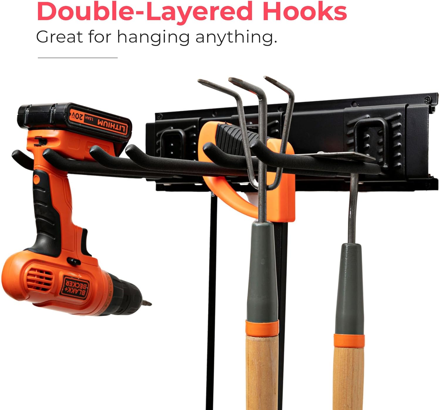 - Dual-function Design - With interchangeable hook and shelf configurations in a modular layout—customize your setup for everything from garden tools to power drills, storage bins and boxes.
