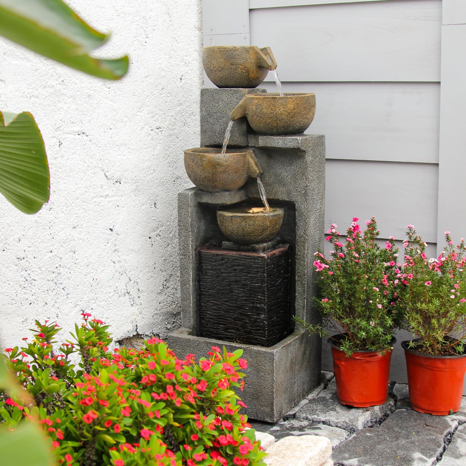 - Modern 5-Tier Design: YZM outdoor water fountain feature a modern design combined with natural elements. The 4-tier bowl design, along with 1-tier cascading tower design, and the gray and brown colors harmonize to create a modern work of art that is a great addition to any home dΓ©cor