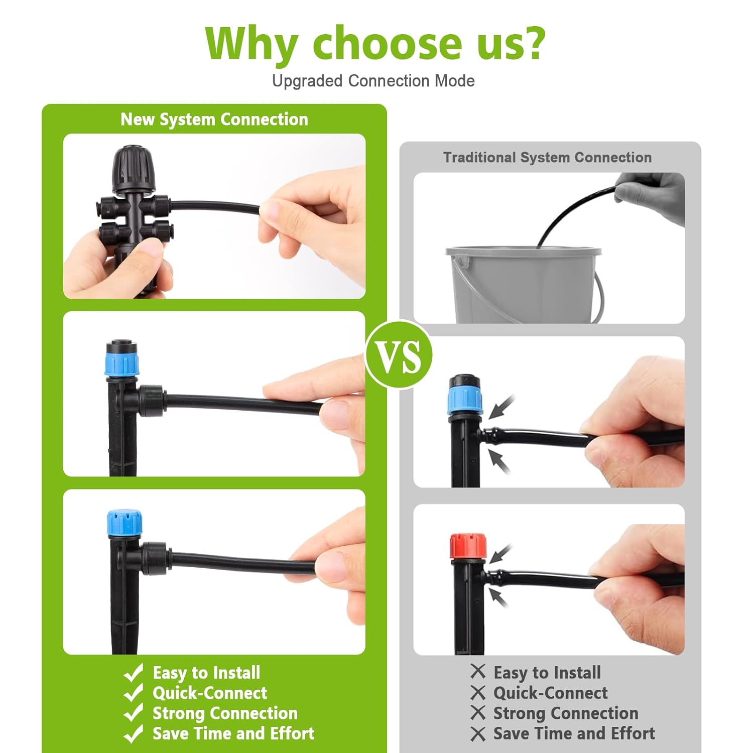 - INNOVATIVE QUICK CONNECTOR TECHNOLOGY: Our plug-and-play irrigation pipe adopts a new quick connector design to ensure a secure installation and prevent water leakage, making installation a breeze and saving you time and energy