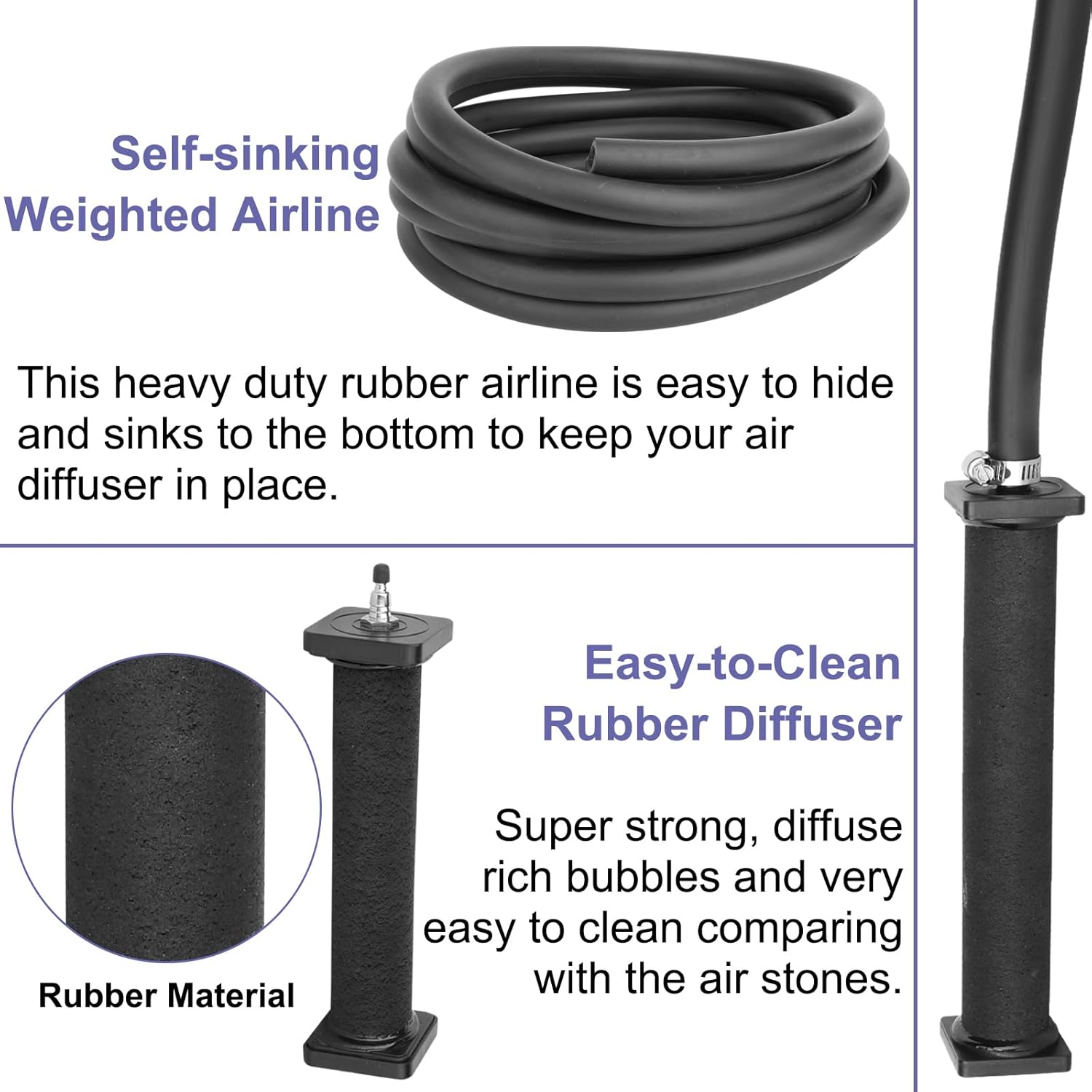 - WEIGHTED SELF-SINKING AIRLINE - Say goodbye to unsightly floating airlines in your pond. This kit includes a weighted airline that stays at the bottom of your pond, even when filled with air. EPDM RUBBER AIR DIFFUSER - The polyporous surface of the EPDM rubber air diffuser effectively diffuses abundant fresh air into the water, maximizing oxygen uptake. It is also nearly maintenance-free and resistant to clogging, ensuring long-lasting performance.