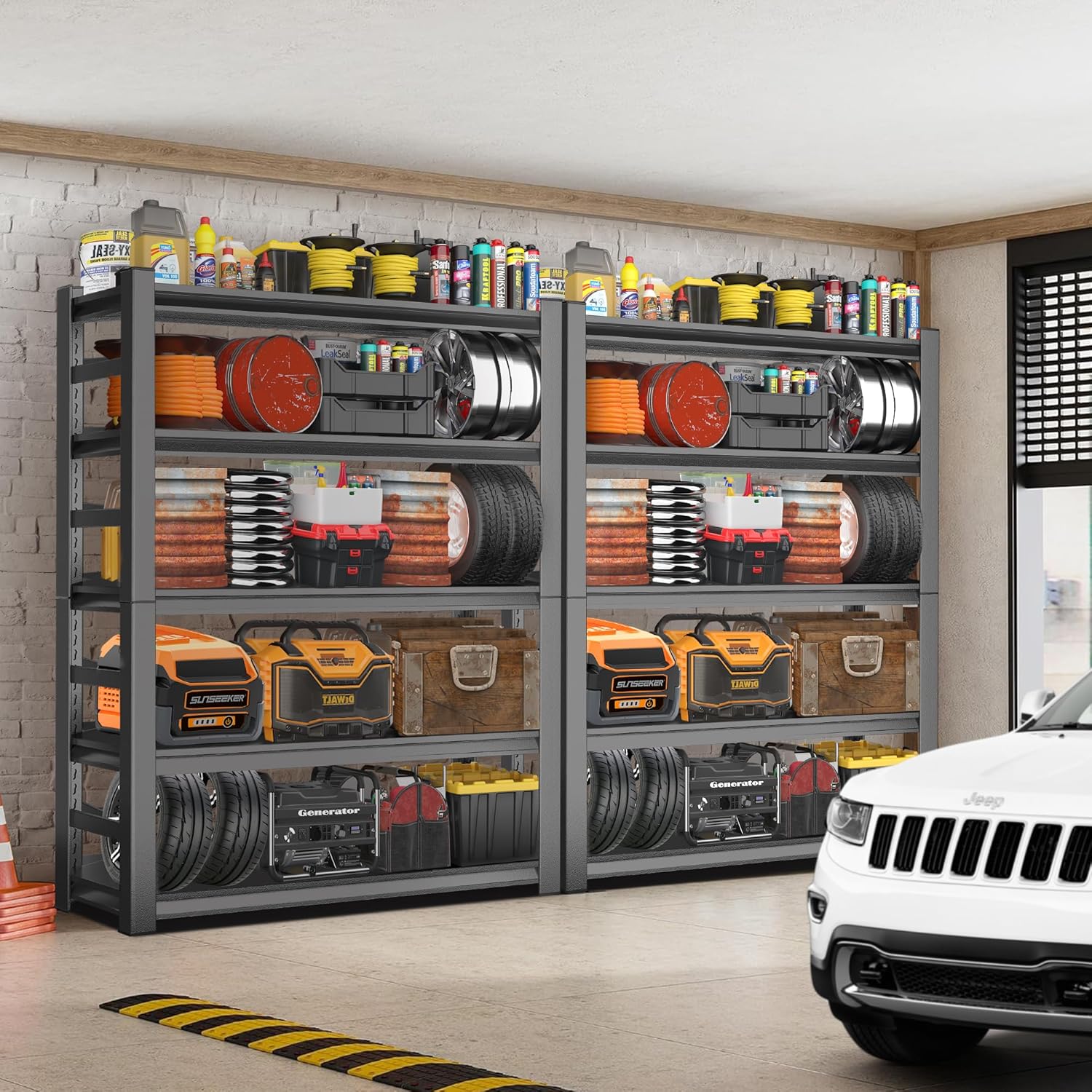 - ăGarage Shelving Heavy DutyăïŒOur metal storage shelves are made of heavy-duty steel and have been upgraded to double layered columns, each with supporting ribs, and the surface of the shelves is coated with high-quality powder coating. It is not only sturdy and durable, but also ensures that the shelf maintains its appearance and performance in various environments. Each shelf can carry up to 800 pounds, and the maximum weight capacity of 4000 lbs.
