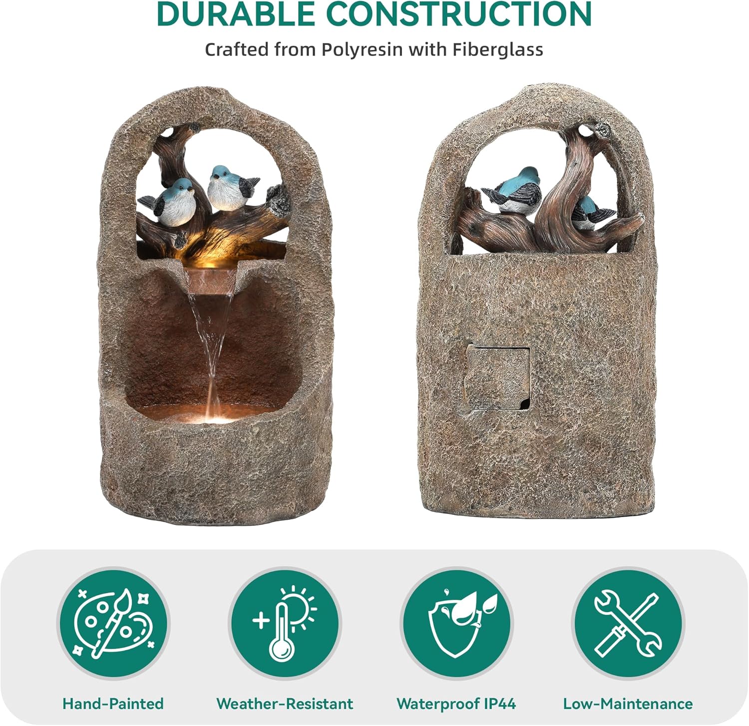 - Zen Natural Outdoor Fountain🎨: This delightful garden floor wall fountain features a pair of playful birds perched on the tree trunks above a pool. With realistic handcrafted embossed textures and a hand-painted faux bronze finish, it adds natural organic and rustic charm to any garden, patio, or porch.