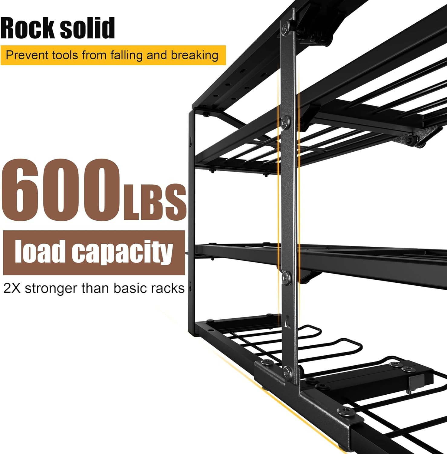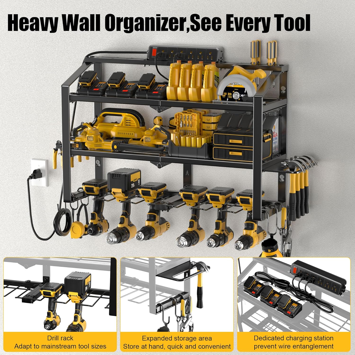 - Heavy-Duty&Durable: Crafted from thickened industrial-grade steel with reinforced full-frame welding, our power tool rack cradles every tool like a reliable partner, supporting 600 lbs. Rust-resistant black powder-coated finish ensures lifelong durability, resisting scratches, rust, and deformation.