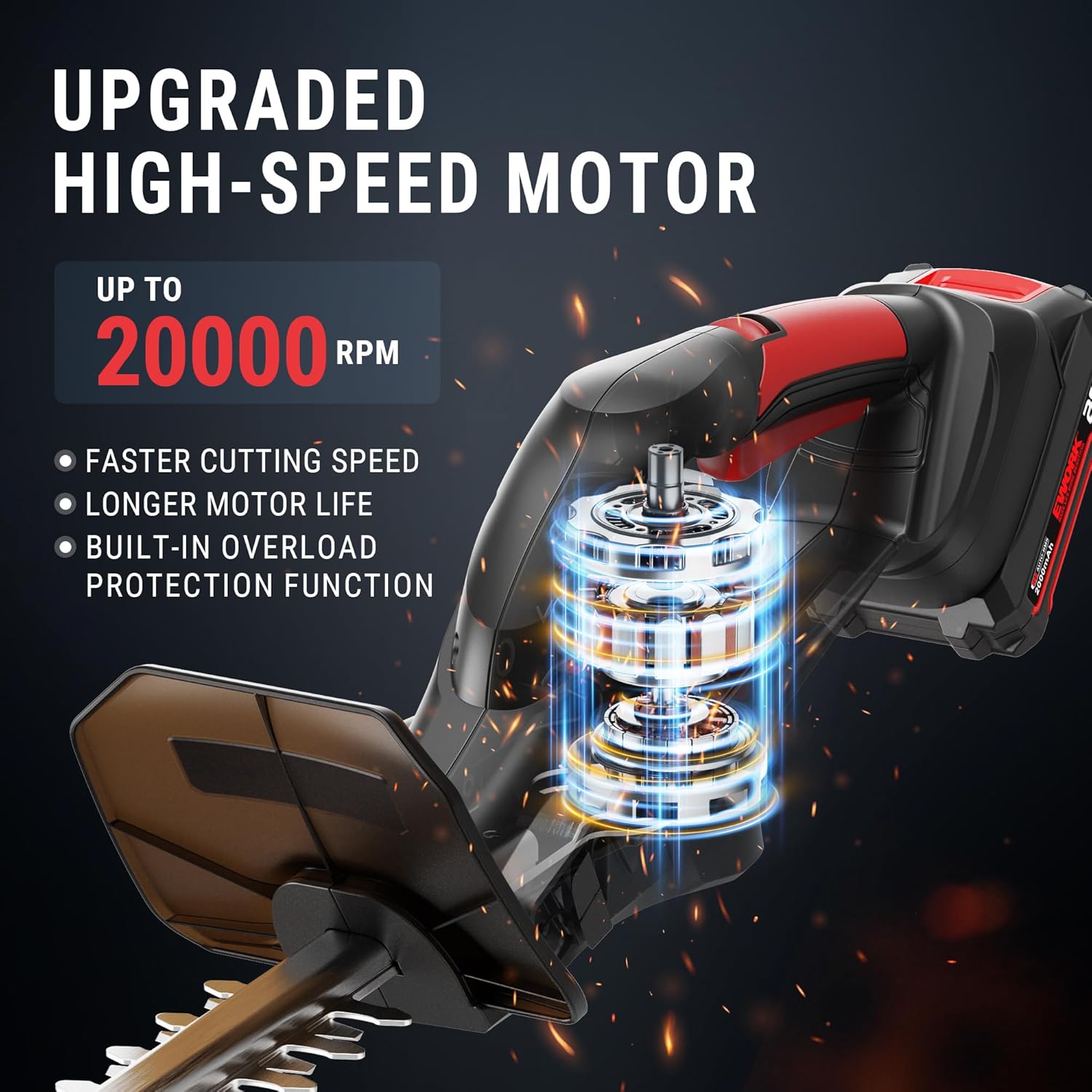 - [Powerful cutting ability] EWORK cordless hedge trimmer is equipped with a reinforced copper wire motor and built-in overcurrent protection program, which improves the stability of hedge trimmer operation and prolongs service life; equipped with a 22-inch double-action laser blade with a cutting diameter of 5/8 inches, this hedge trimmer can complete almost all garden work and bring you an extraordinary hedge trimming experience