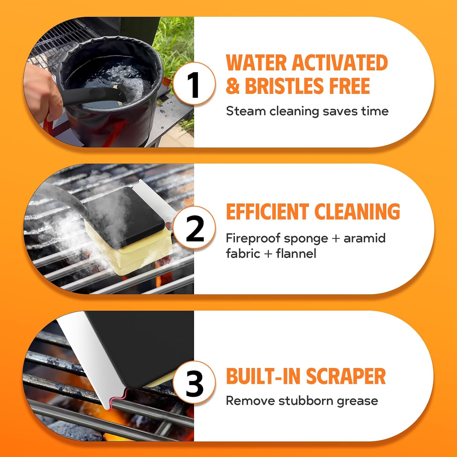 - Sturdy & Safer: Double "S" MEANS Crafted with FIREPROOF SPONGE + ARAMID FABRIC + FLANNEL, this Bristle-Free Barbecue Brush withstands high temperatures, making it a reliable tool for all your grilling needs, even on hot grills ( Our premium grilling cleaning head is heat resistant up to 600°F )
