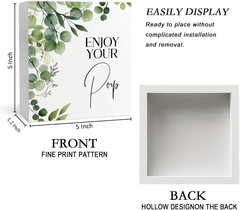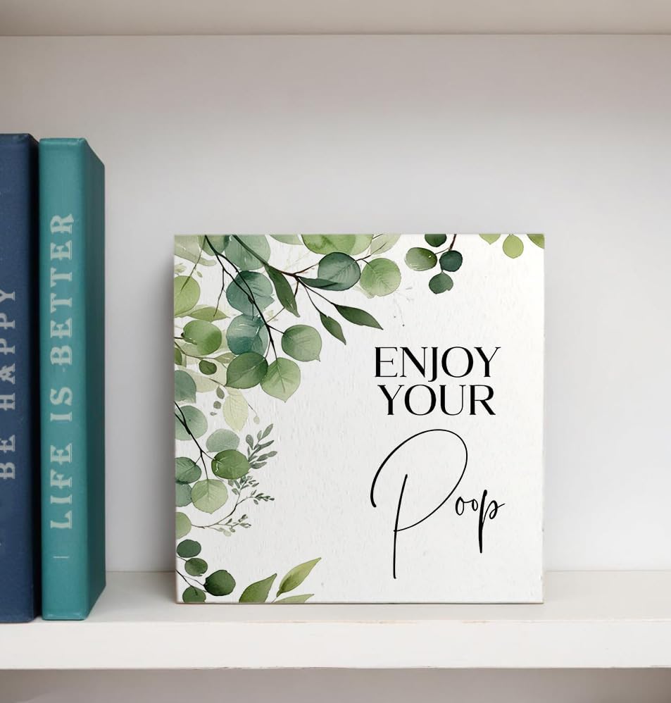 Funny Bathroom Signs, Enjoy Your Poop Humorous Wooden Box Sign, Eucalyptus Botanical Wood Signs Plaque for Bathroom Washroom Toilet Counter Shelf Table Decor, 5x5 Inch