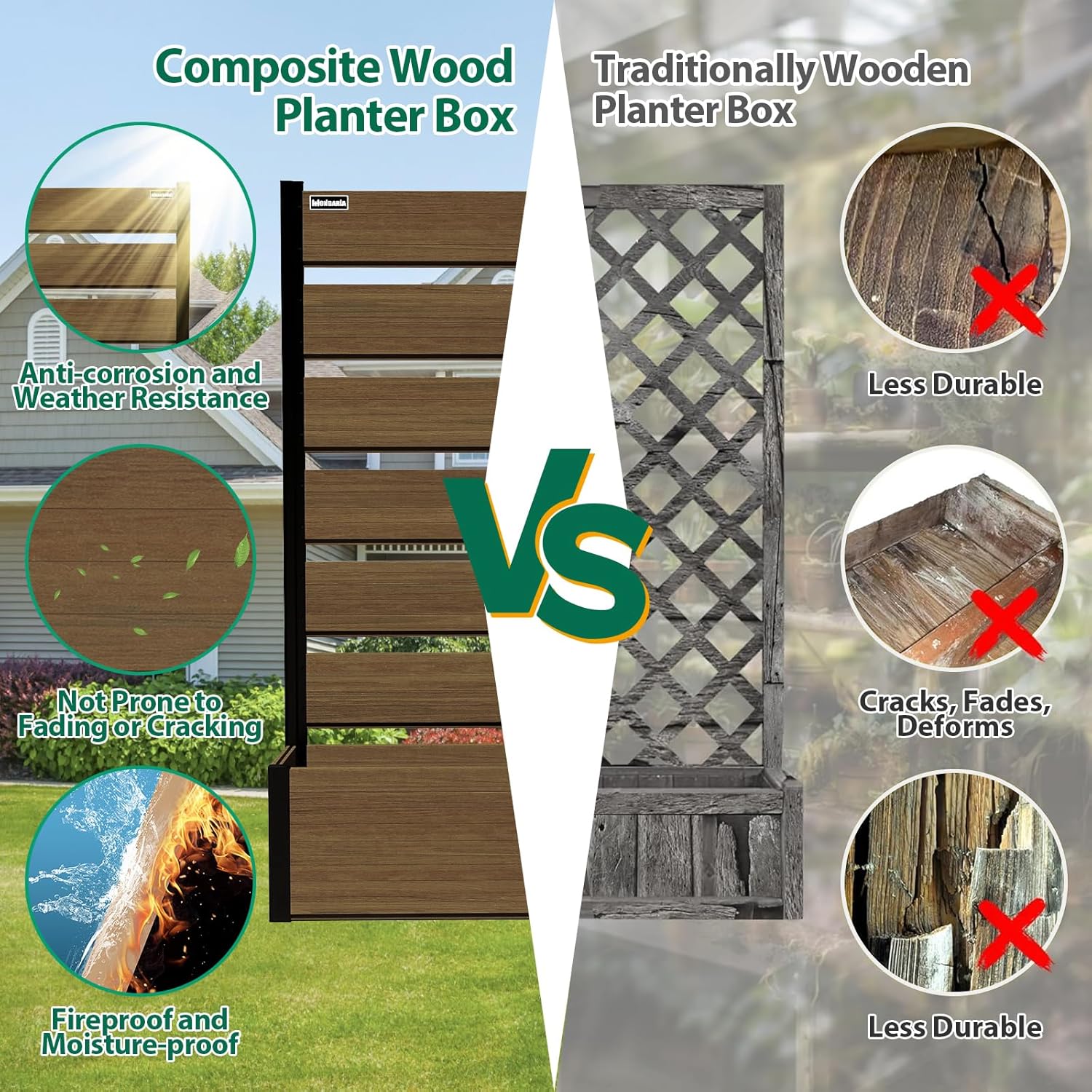 - Durable & Weather-Resistant: Built with weather-resistant composite wood and high-quality aluminum, this planter bed is designed to withstand hot summers, cold winters, and everything in between, ensuring long-lasting beauty and functionality.