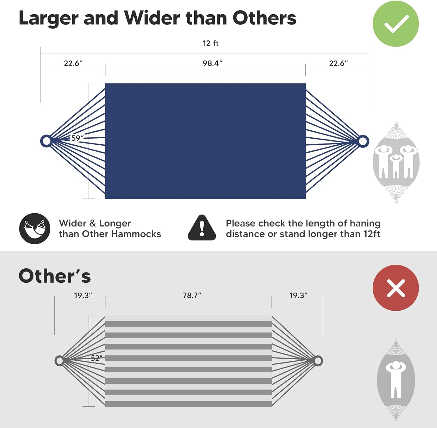 - Larger Bearing Capacity: The heavy duty hammock's total length (from loop to loop) is 144 Inches while the bed size is 98βlong X 59βwide, making it perfect for couples