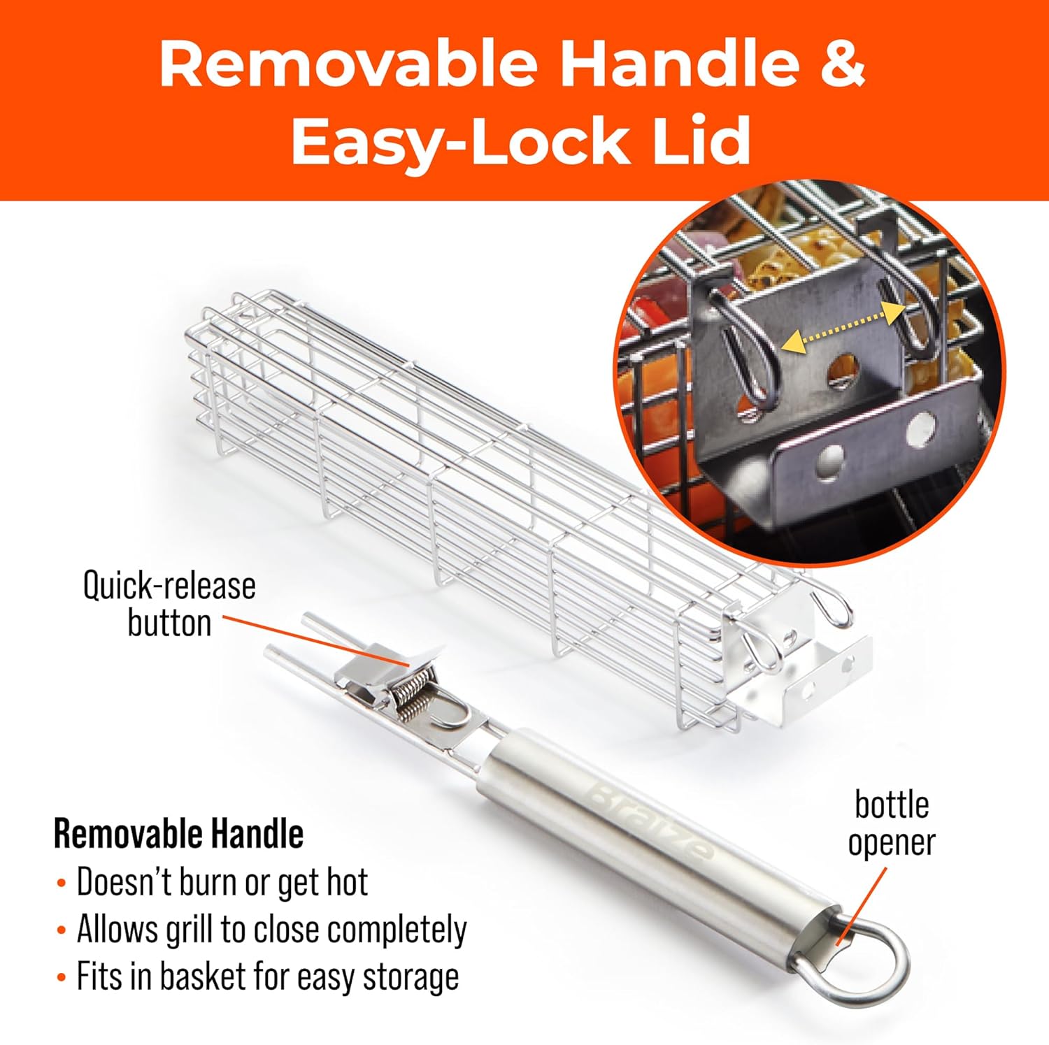- REMOVABLE HANDLE – The detachable handle makes it easy to flip your kabobs without getting too close to the heat. Once you're done grilling, just remove the handle for compact storage and easy transport.