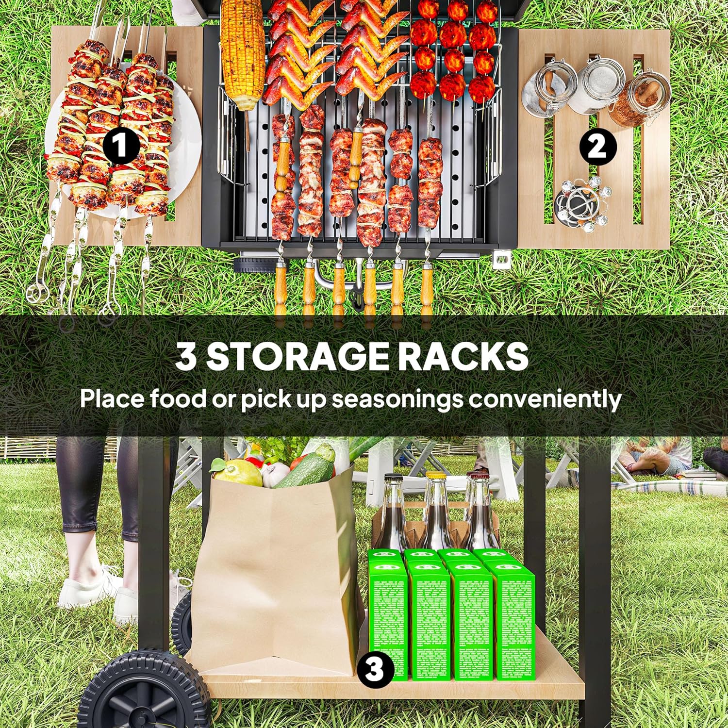 - Convenient Meal Prep: Features two side shelves and a bottom shelf for storage, keeping all essentials close by to let the grill double as an outdoor meal prep station. Built-in bottle opener means that you'll always have an easy way to open your drinks