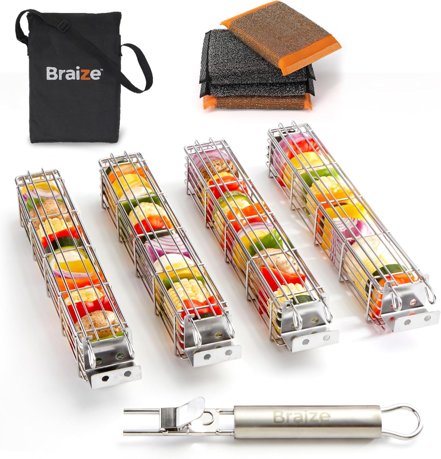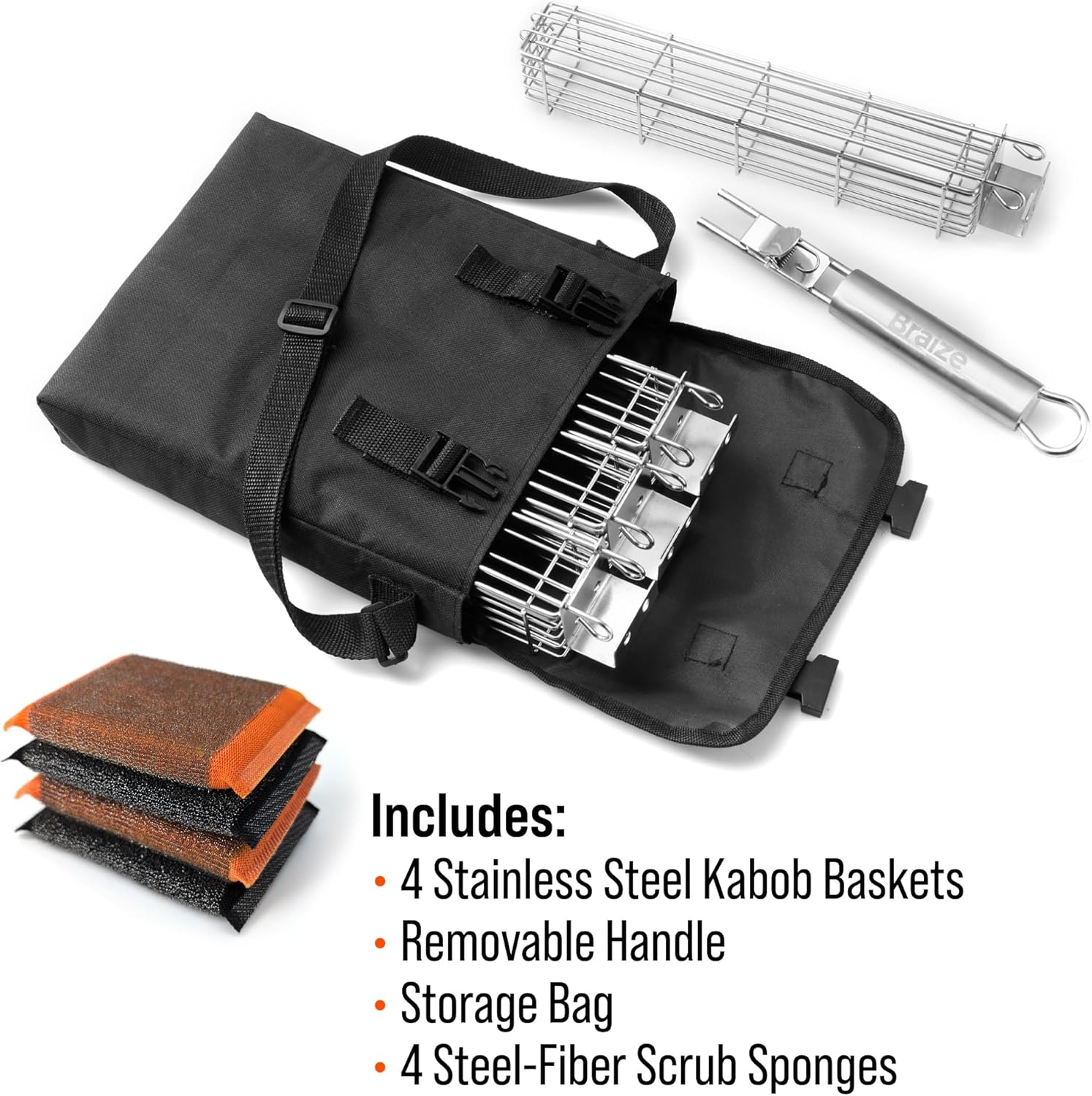 Kabob Grilling Basket Set of 4 with Removable Handle – Stainless Steel Baskets for Grilling Vegetables, Fish & Kabobs – Outdoor BBQ Accessories with Heavy-Duty Scrub Sponge