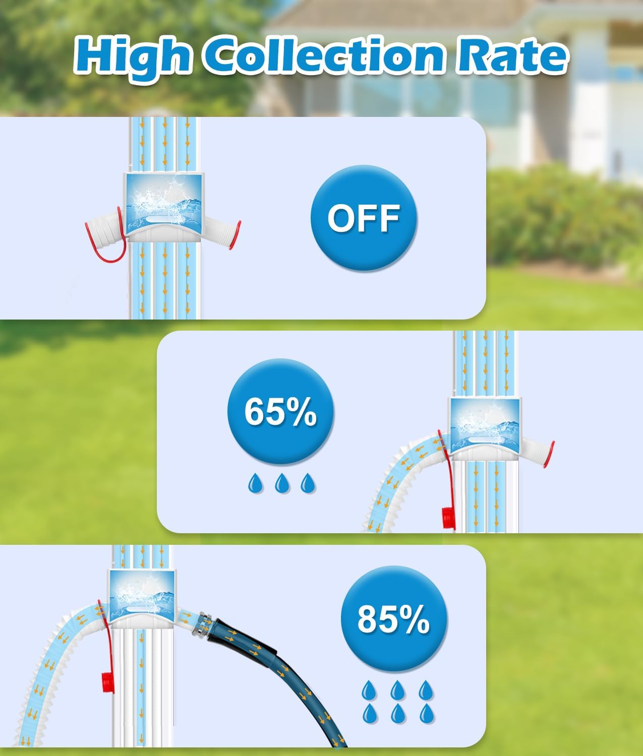 - Efficient Rain Water Collection System: Dual outlets collect a maximum of 85% of the rainwater and blocking one side outlet collects 65% of the rainwater. If the rain barrel is full of water, you can use a silicone plug to block the spout to prevent rainwater from entering the rain barrel and prevent water from overflowing