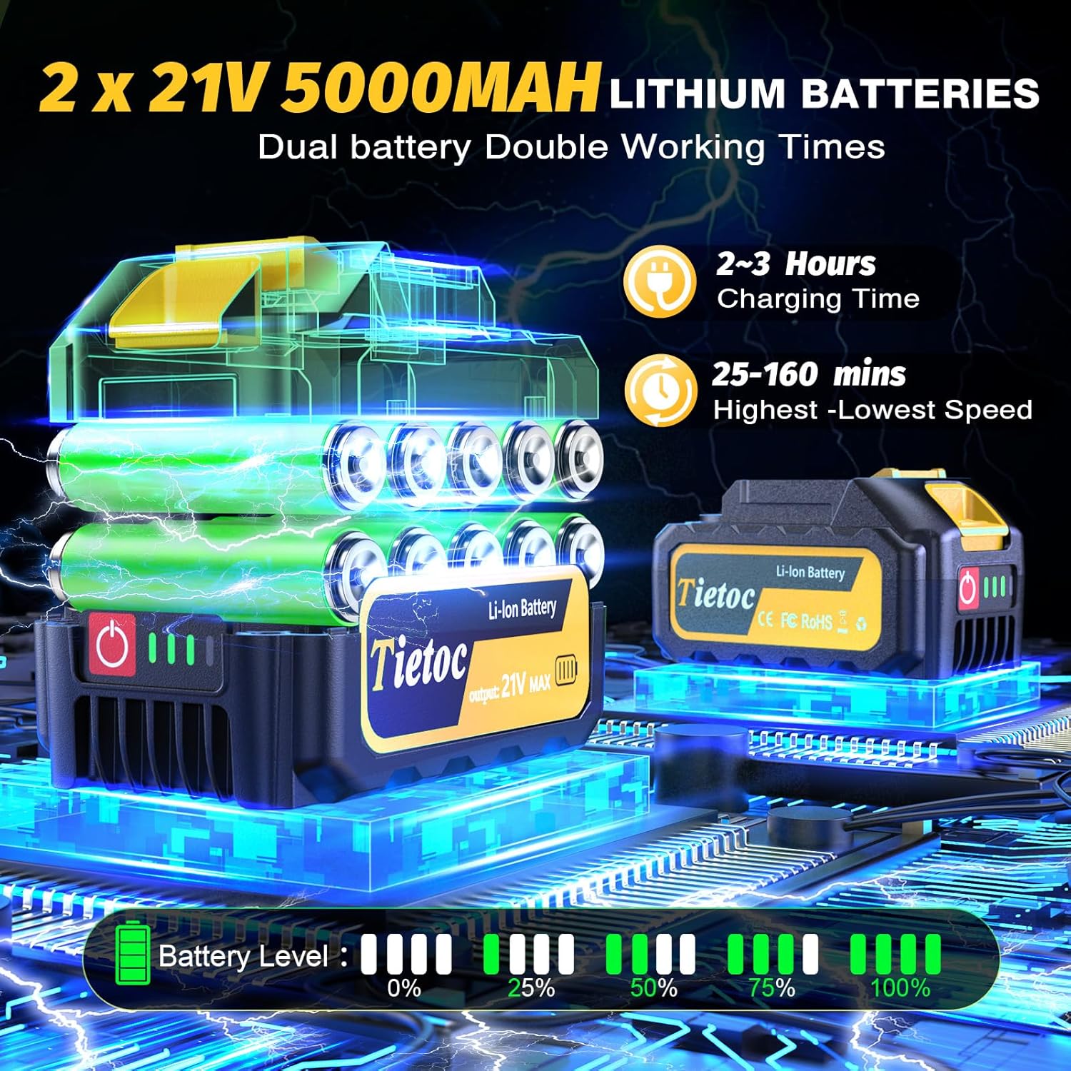 - ๐๐๐๐๐๐๐ฆ๐๐ก ๐๐๐ญ๐ญ๐๐ซ๐ฒ ๐๐จ๐ง๐ -๐ฅ๐๐ฌ๐ญ๐ข๐ง๐ ๐๐ง๐๐ฎ๐ซ๐๐ง๐๐: Battery powered leaf blower with two 21V 5.0Ah high-capacity lithium batteries and a safety charger. Users can charge one while using the other, enabling theoretical "infinite runtime"โideal for continuous tasks like yard cleaning and lawn maintenance. 2 batteries can last at most 25 minutes at highest speed and 160 minutes at lowest speed. The batteries are equipped with overheat protection, which is safe and reliable
