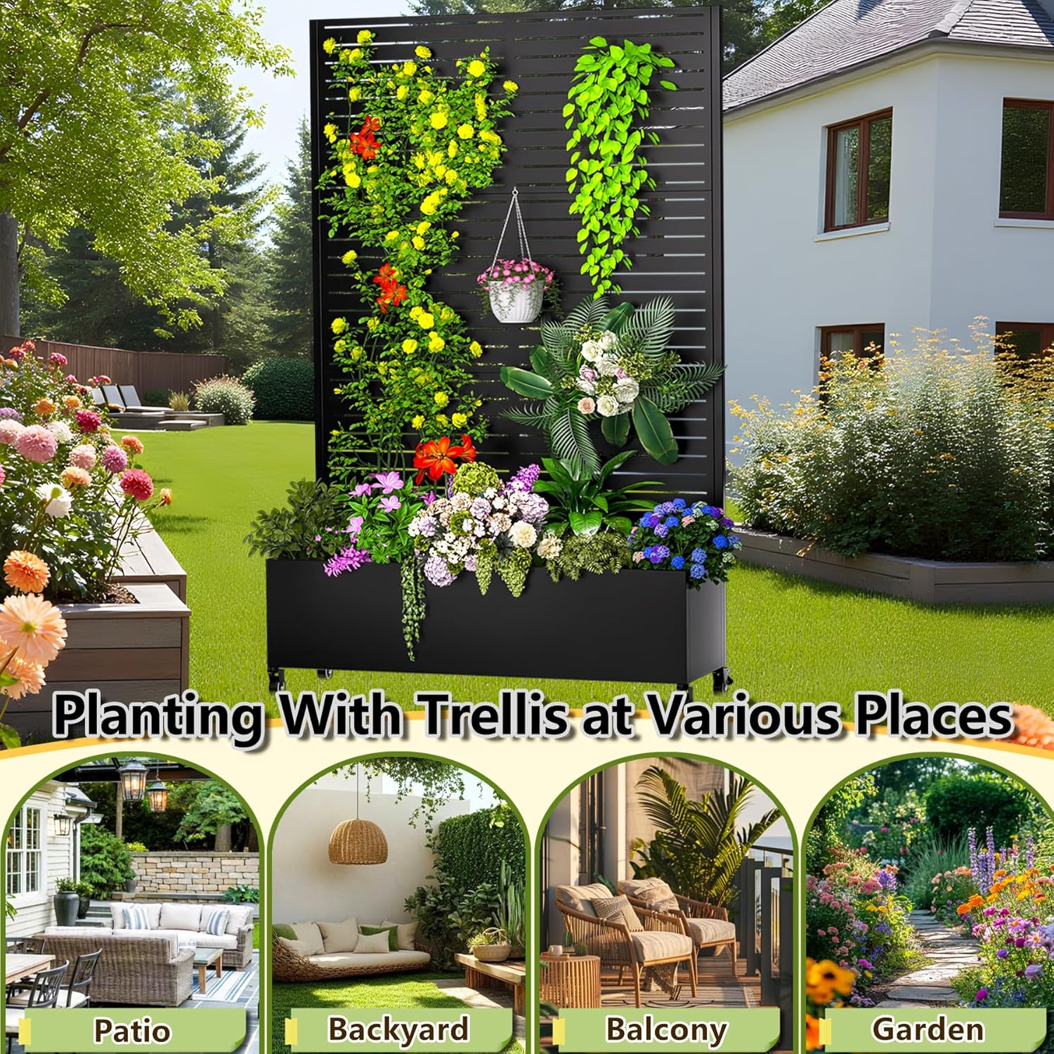 - 【3-in-1 Metal Planter Box with Trellis】This 72-inch tall metal planter box with trellis serves as an elevated garden bed for flowers, vegetables, and fruits, a sturdy support for climbing plants, and a stylish privacy screen to enhance any patio, lawn, or garden space. Perfect for versatile outdoor planting and decoration.